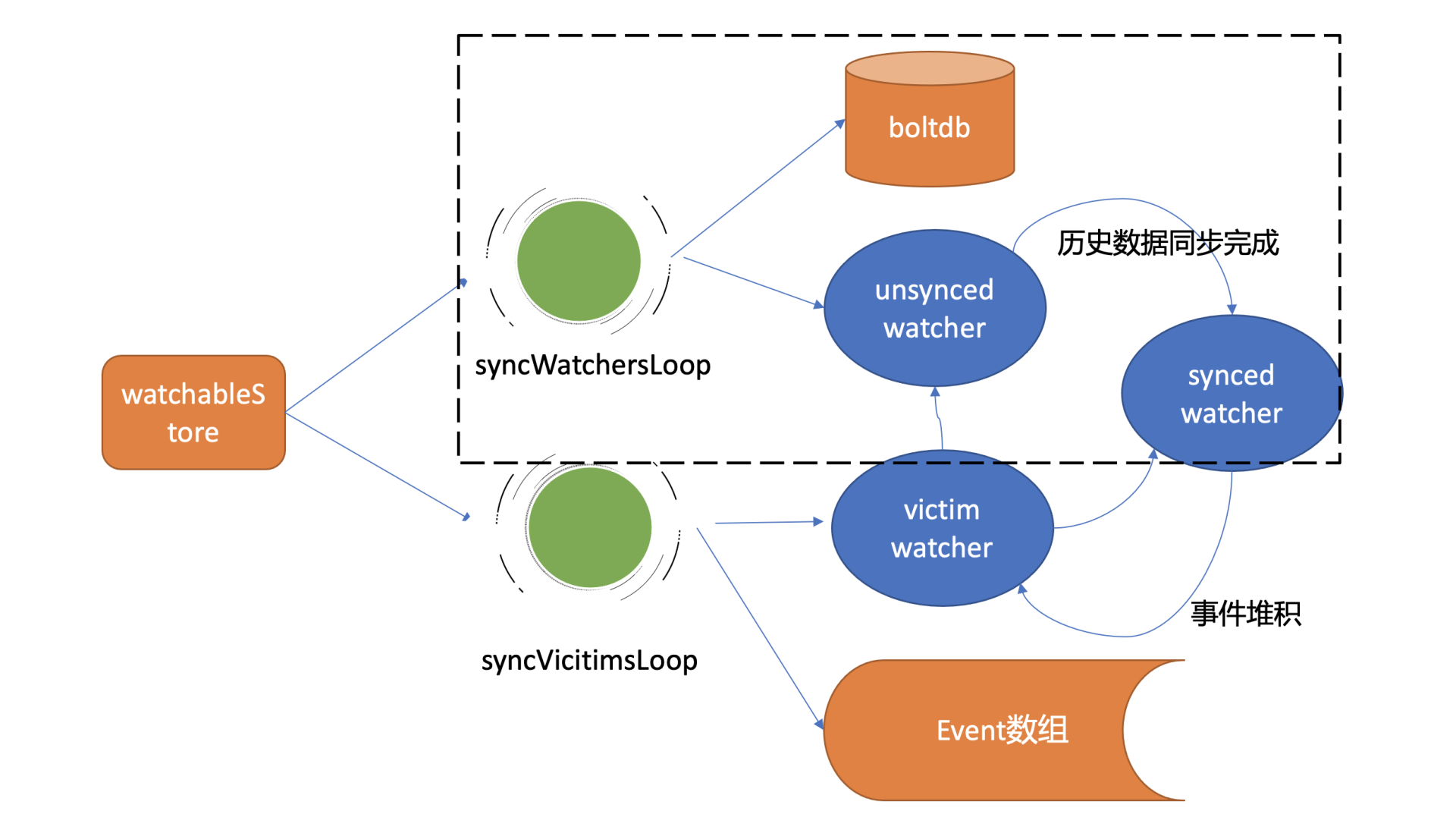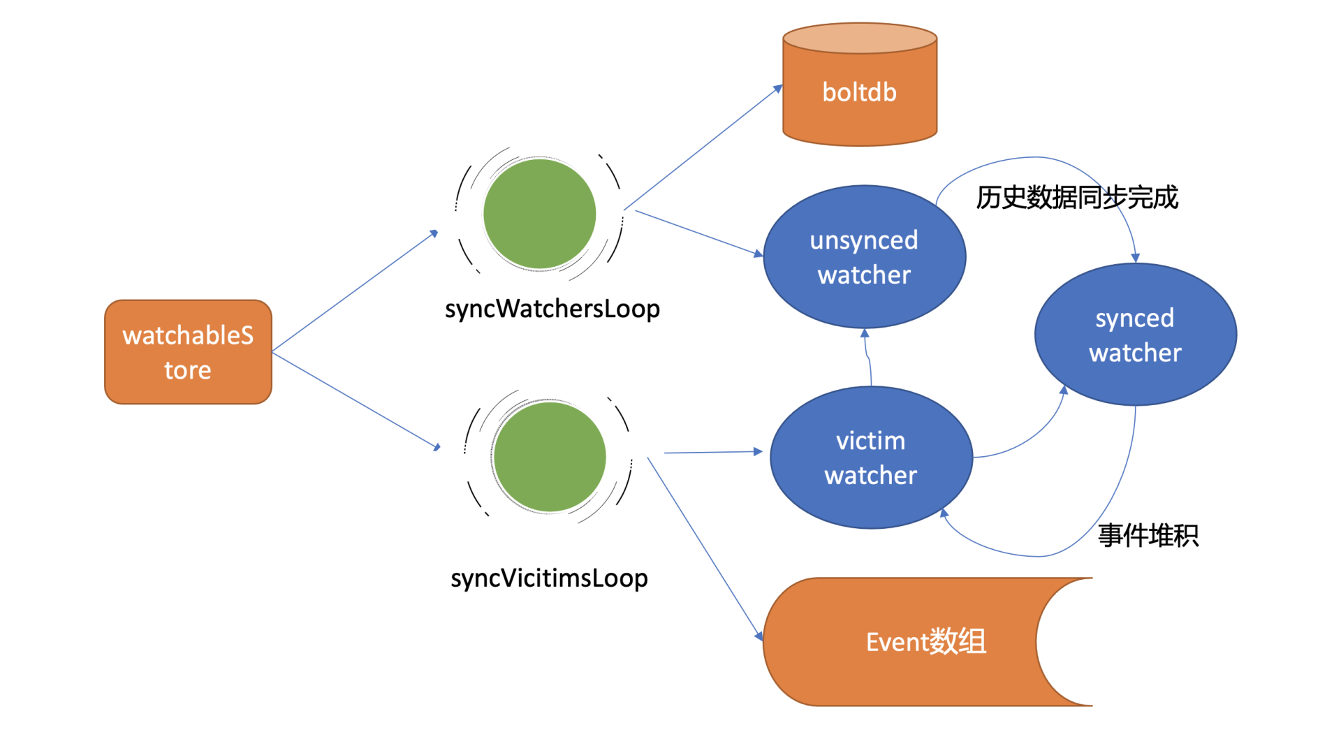 它的基本工作原理是,遍历victim watcherBatch数据结构,尝试将堆积的事件再次推送到watcher的接收channel中。若推送失败,则再次加入到victim watcherBatch数据结构中等待下次重试。
