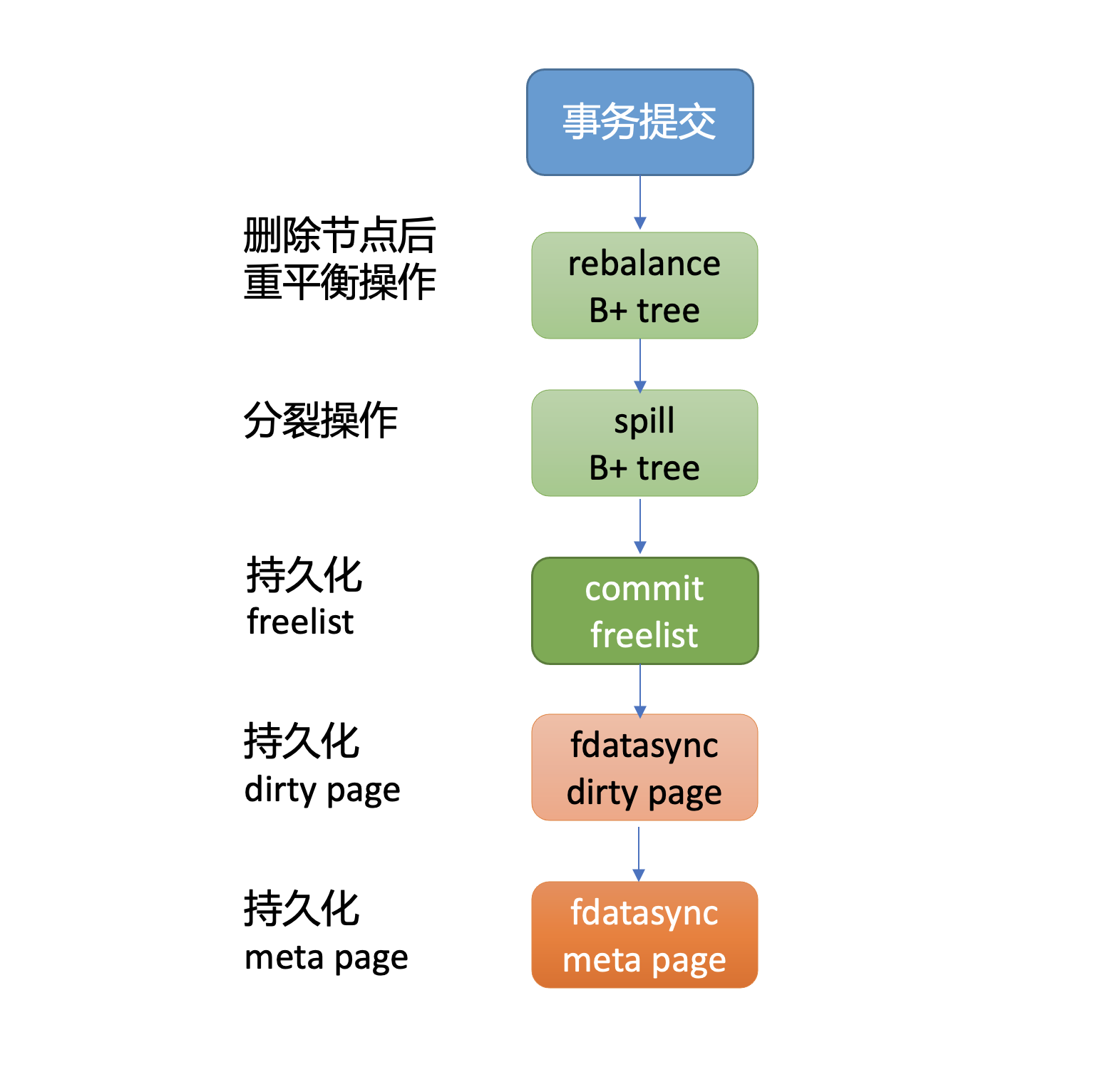 当你的代码执行tx.Commit API时,它才会将我们上面保存到node内存数据结构中的数据,持久化到boltdb中。下图我给出了一个事务提交的流程图,接下来我就分别和你简要分析下各个核心步骤。