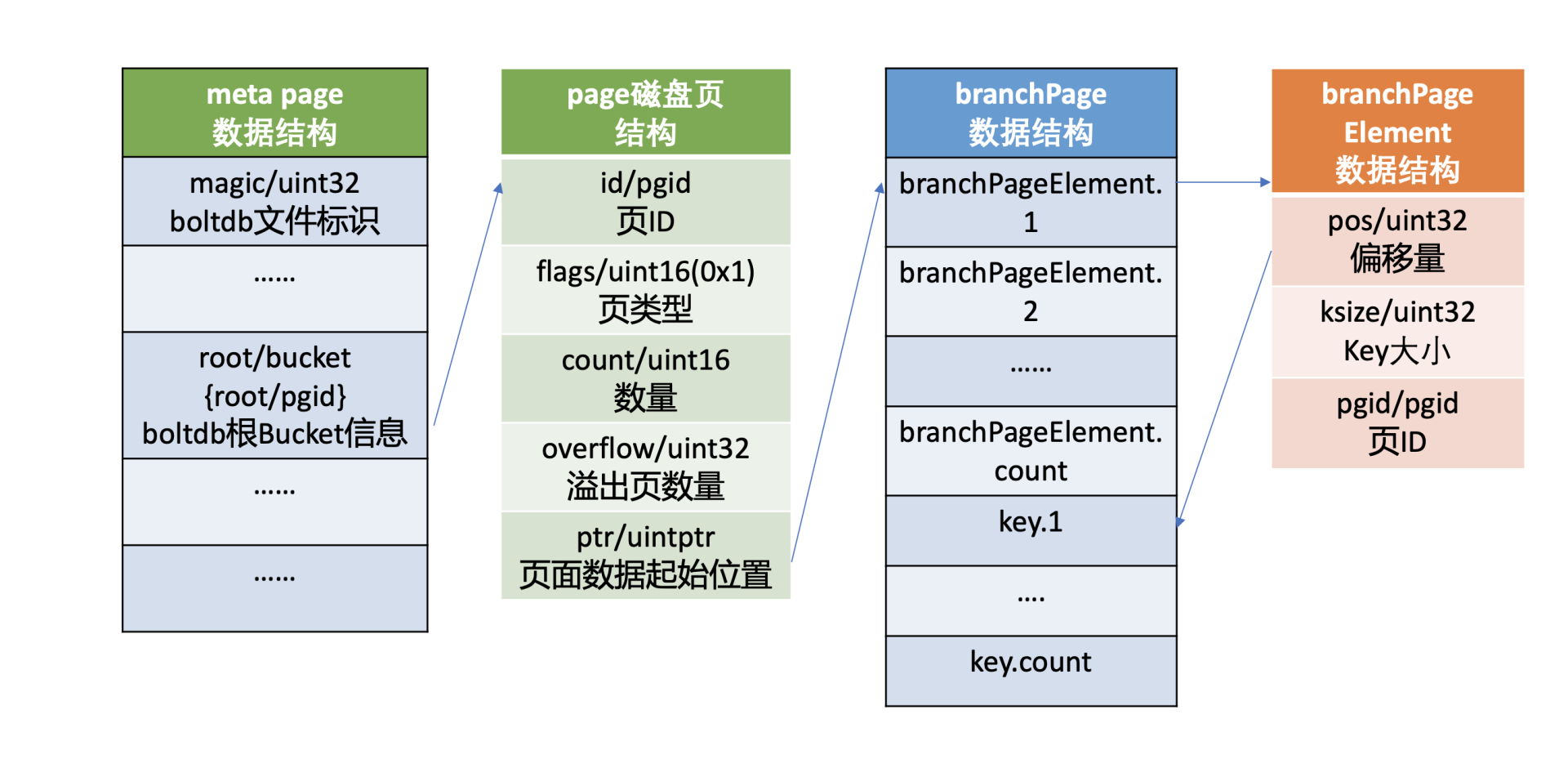 branchPageElement包含key的读取偏移量、key大小、子节点的page id。根据偏移量和key大小,我们就可以方便地从branch page中解析出所有key,然后二分搜索匹配key,获取其子节点page id,递归搜索,直至从bucketLeafFlag类型的leaf page中找到目的bucket name。