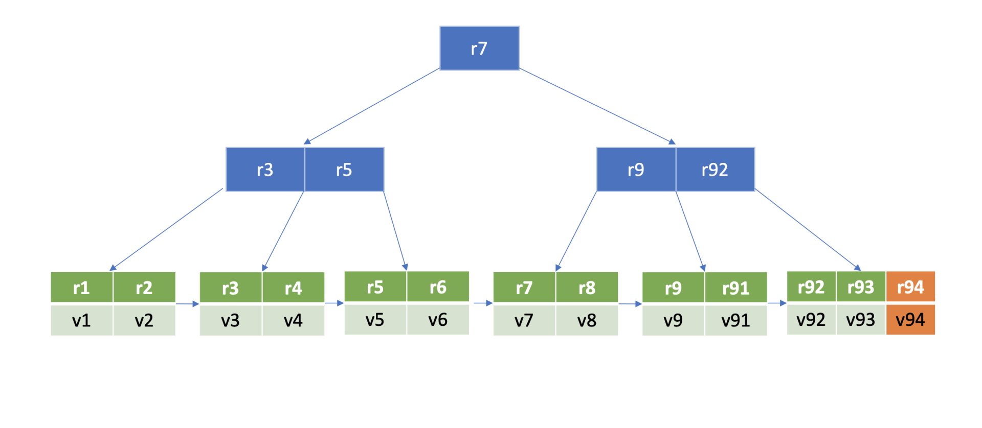 首先从上面put案例中我们可以看到,插入了一个新的元素在B+ tree的叶子节点,它可能已不满足B+ tree的特性,因此事务提交时,第一步首先要调整B+ tree,进行重平衡、分裂操作,使其满足B+ tree树的特性。上面案例里插入一个key r94后,经过重平衡、分裂操作后的B+ tree如下图所示。
