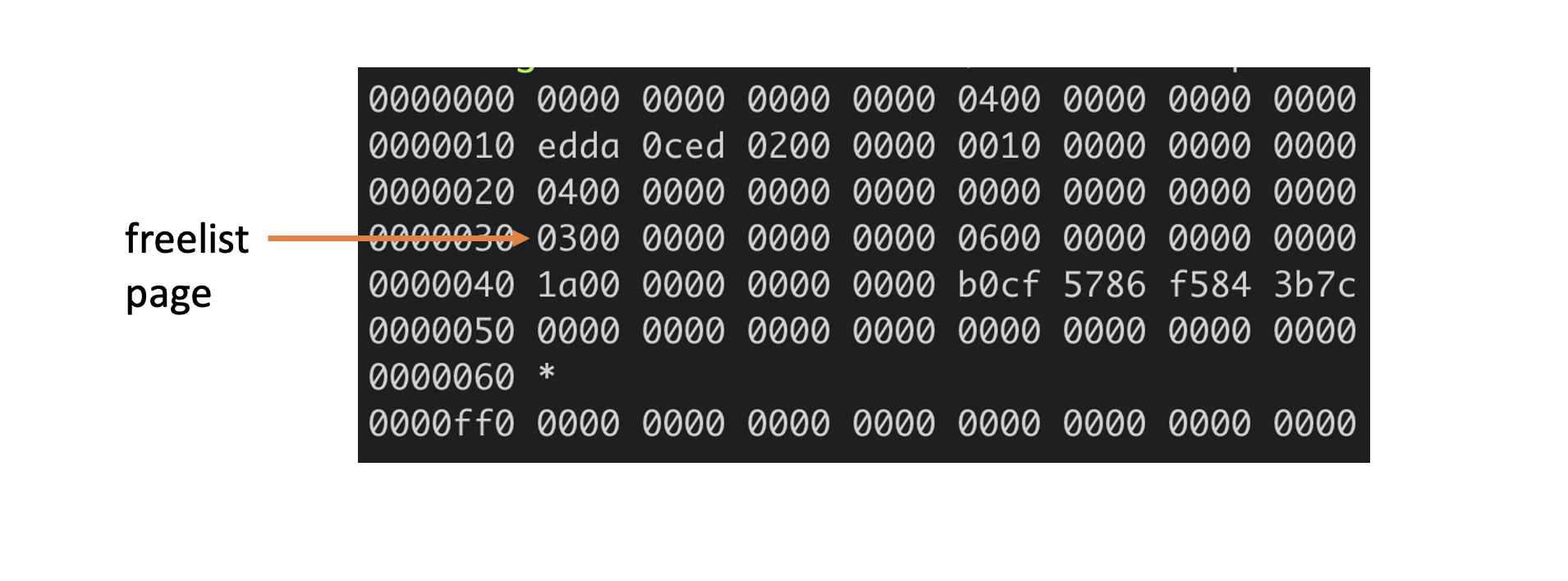 第四行中前面的8个字节,0x3表示freelist页面ID,此页面记录了db当前哪些页面是空闲的。后面8个字节,0x6表示当前db总的页面数。
