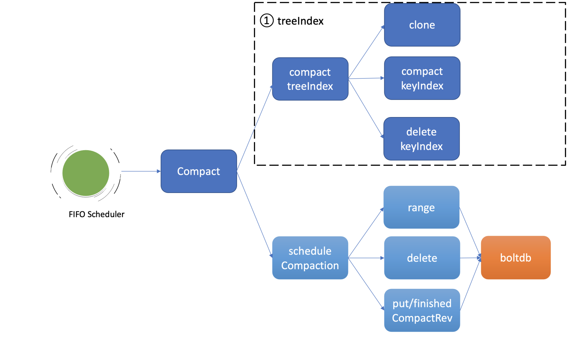 Compact接口首先会更新当前server已压缩的版本号,并将耗时昂贵的压缩任务保存到FIFO队列中异步执行。压缩任务执行时,它首先会压缩treeIndex模块中的keyIndex索引,其次会遍历boltdb中的key,删除已废弃的key。