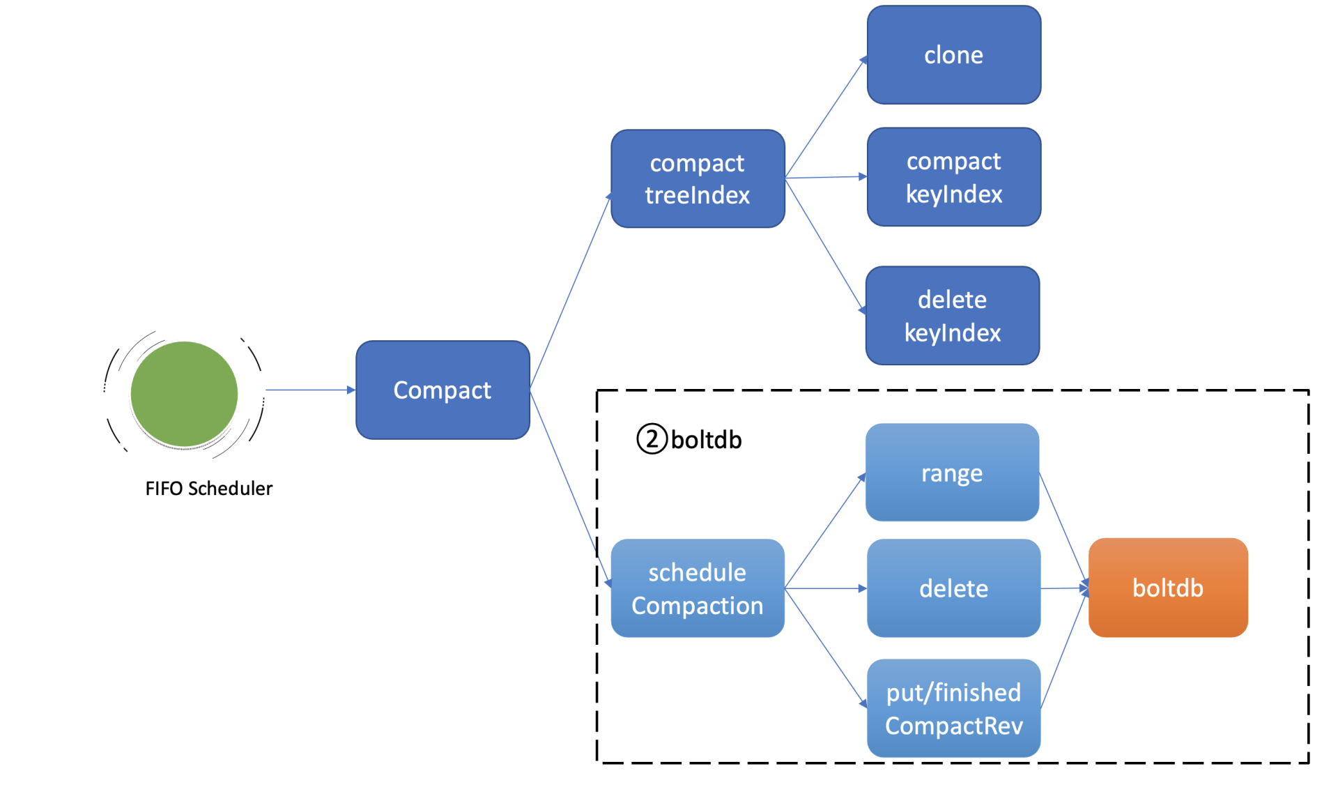 通过检查后,Compact接口会通过boltdb的API在meta bucket中更新当前已调度的压缩版本号(scheduledCompactedRev)号,然后将压缩任务追加到FIFO Scheduled中,异步调度执行。