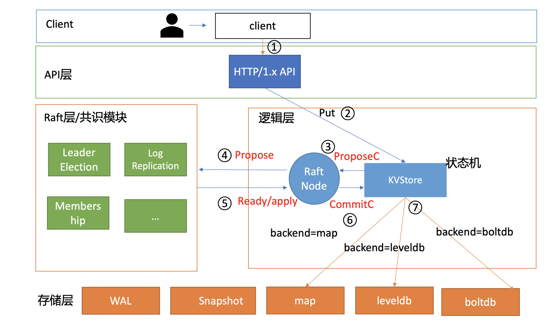 介绍完在metcd项目中如何使用Raft共识模块、支持多存储引擎后,我们再从整体上介绍下在metcd中写入和读取一个key-value的流程。