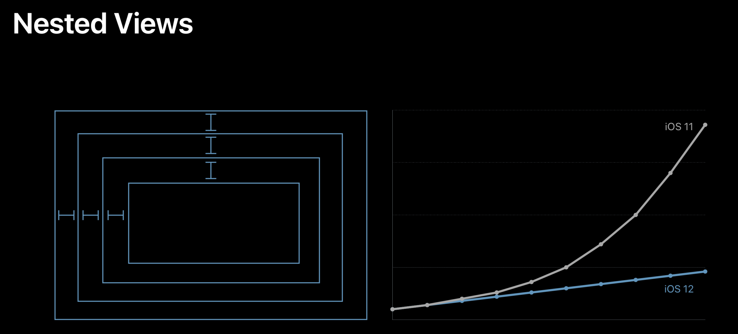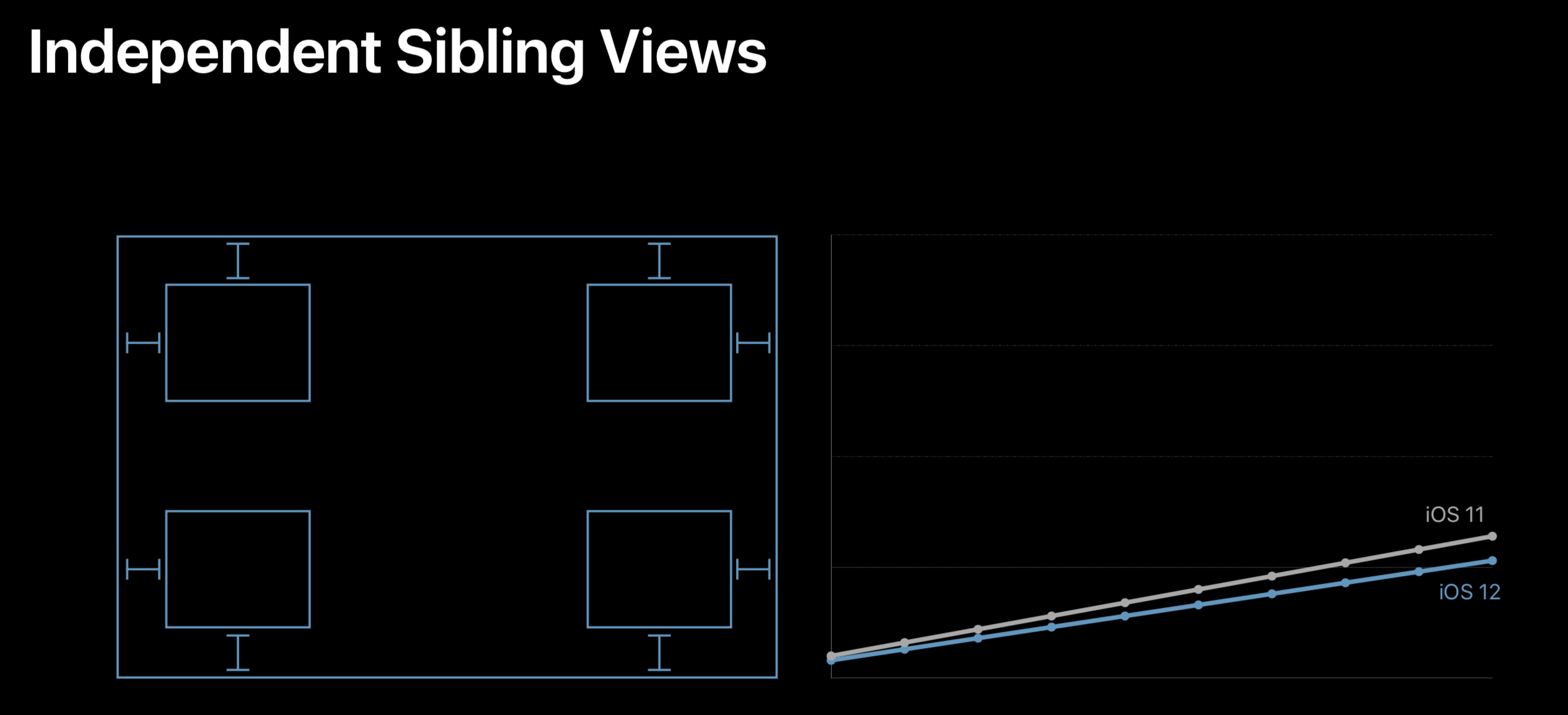 上图是 WWDC 2018 中 202 Session 里讲到的Auto Layout 在 iOS 12 中优化后的表现。可以看到,优化后的性能,已经基本和手写布局一样可以达到性能随着视图嵌套的数量呈线性增长了。而在此之前的Auto Layout,视图嵌套的数量对性能的影响是呈指数级增长的。