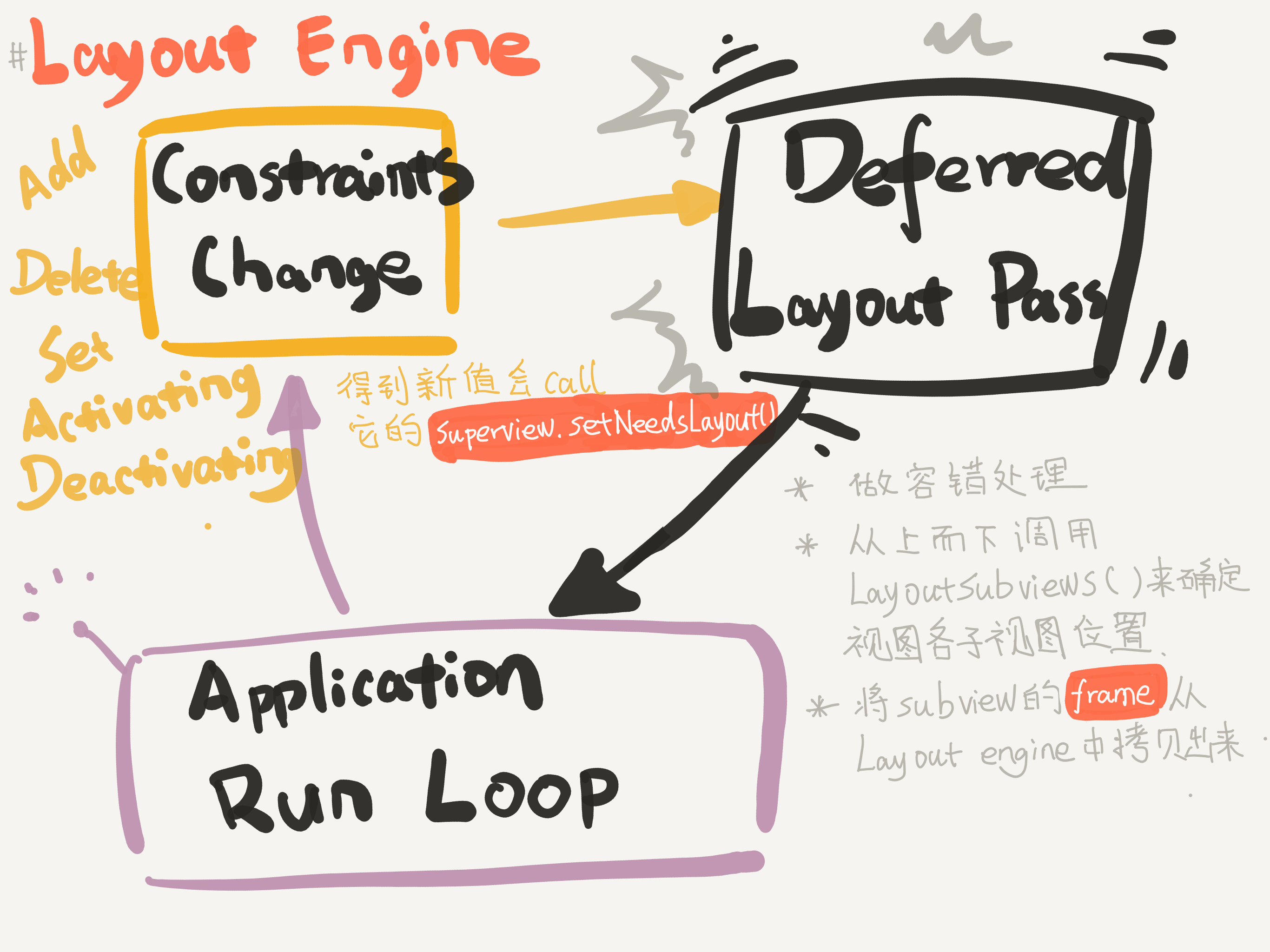 图中, Constraints Change 表示的就是约束变化,添加、删除视图时会触发约束变化。Activating 或 Deactivating,设置 Constant 或 Priority 时也会触发约束变化。Layout Engine 在碰到约束变化后会重新计算布局,获取到布局后调用 superview.setNeedLayout(),然后进入 Deferred Layout Pass。