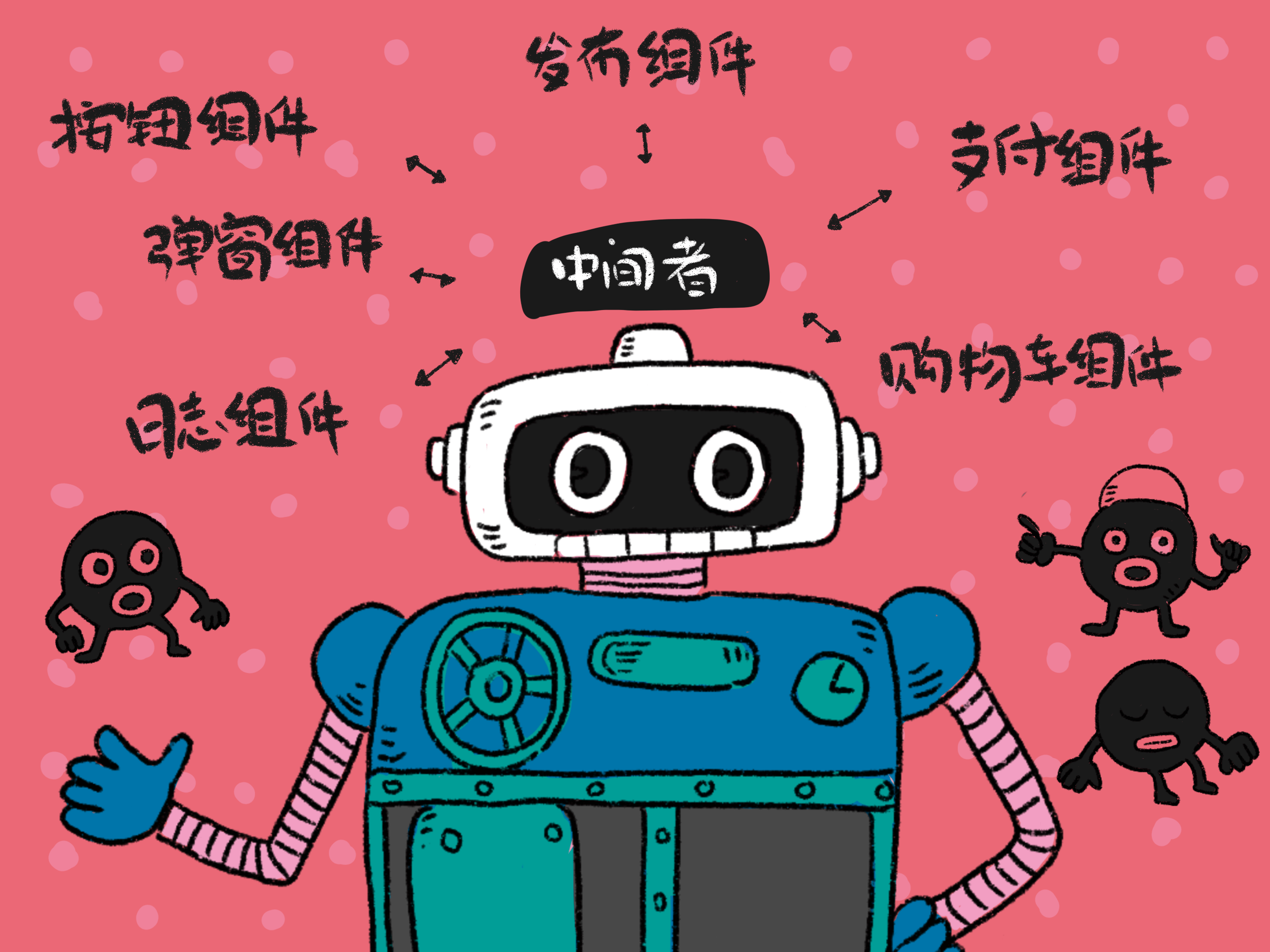另一种常用的架构形式是中间者架构。它采用中间者统一管理的方式,来控制 App 的整个生命周期中组件间的调用关系。同时,iOS 对于组件接口的设计也需要保持一致性,方便中间者统一调用。