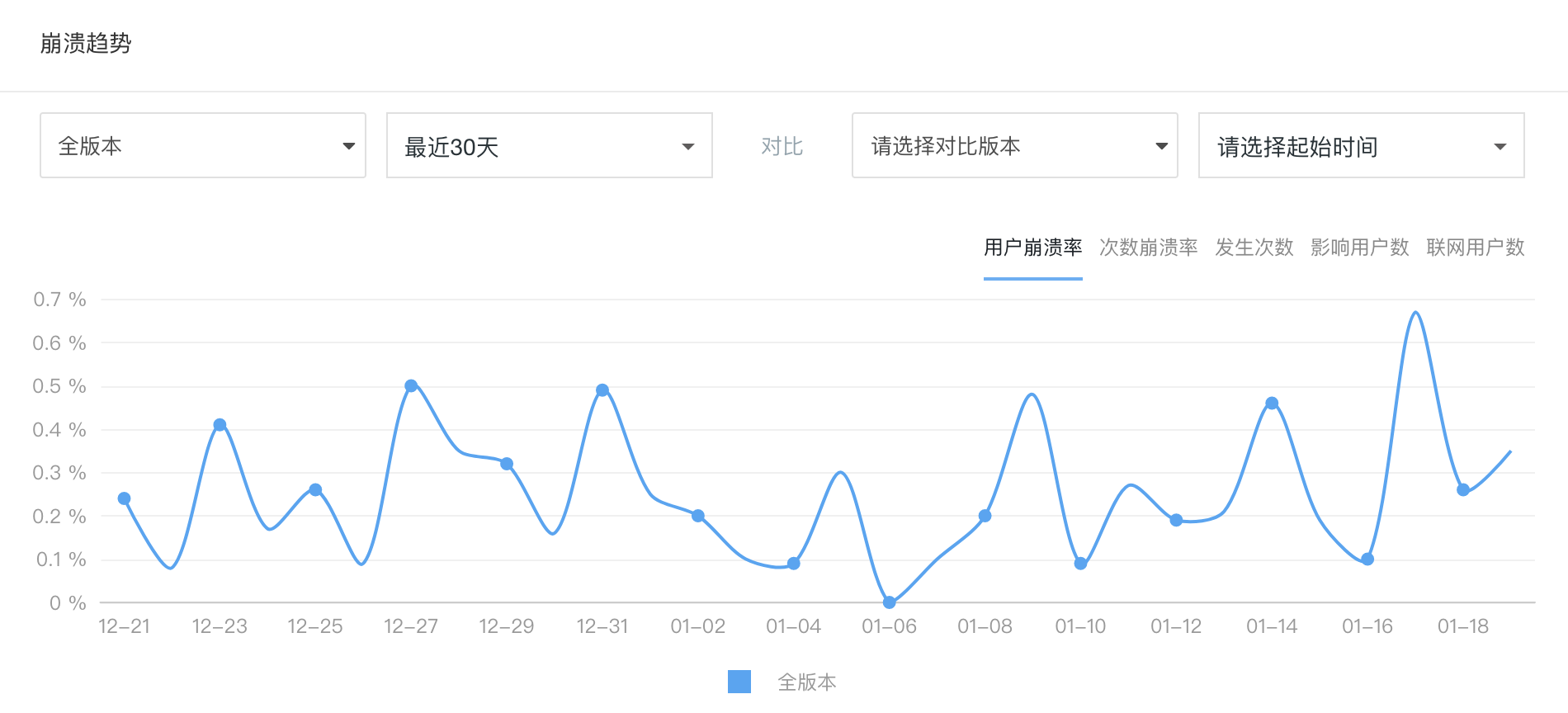 上图展示的就是整体崩溃情况的趋势图,你可以选择 App 的不同版本查看不同时间段的趋势。这个相当于总控台,能够全局观察 App 的崩溃大盘。