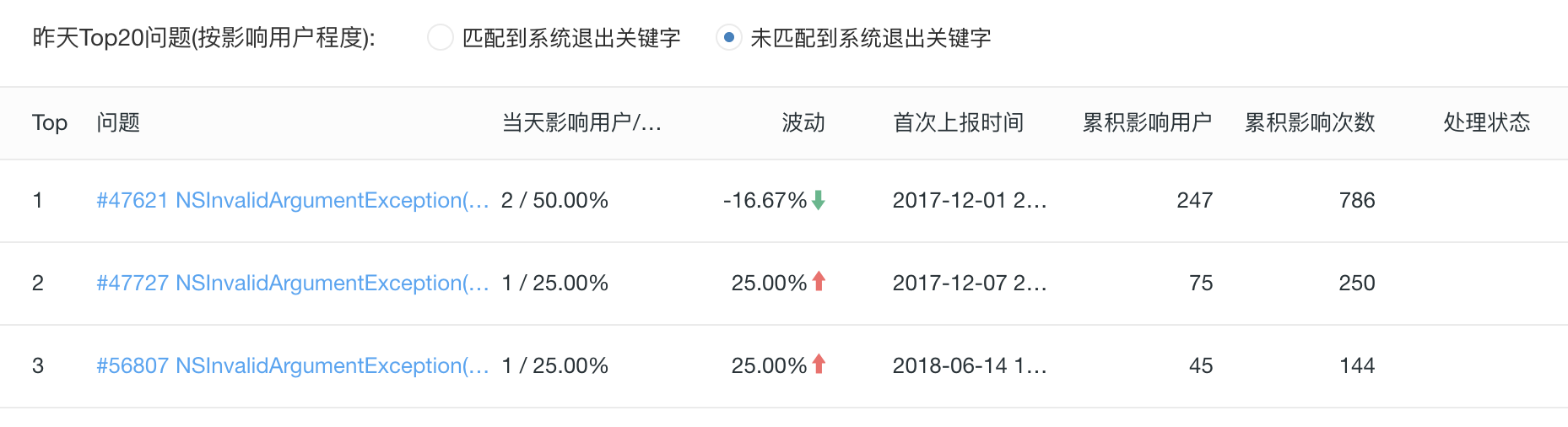 有了全局大盘信息,一旦出现大量崩溃,你就需要明白是哪些方法调用出现了问题,需要根据影响的用户数量按照从大到小的顺序排列出来,优先解决影响面大的问题。如下图所示: