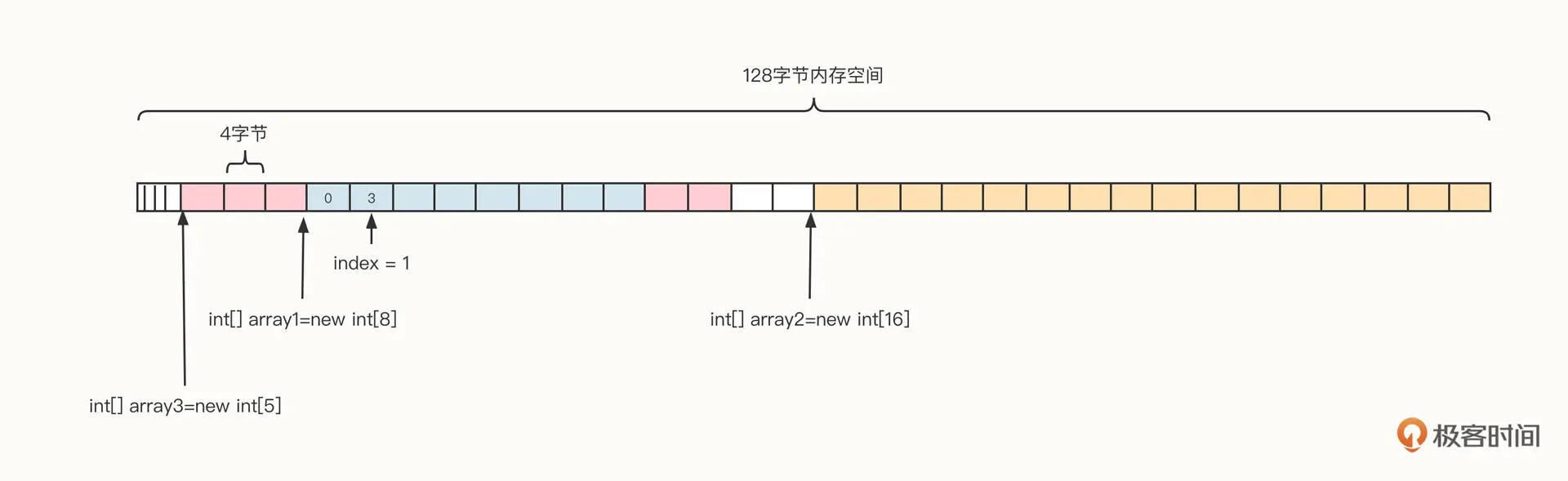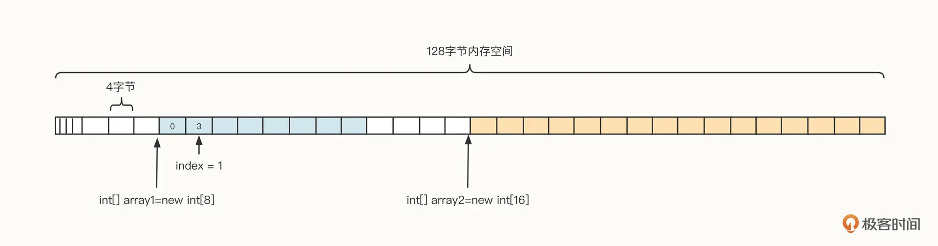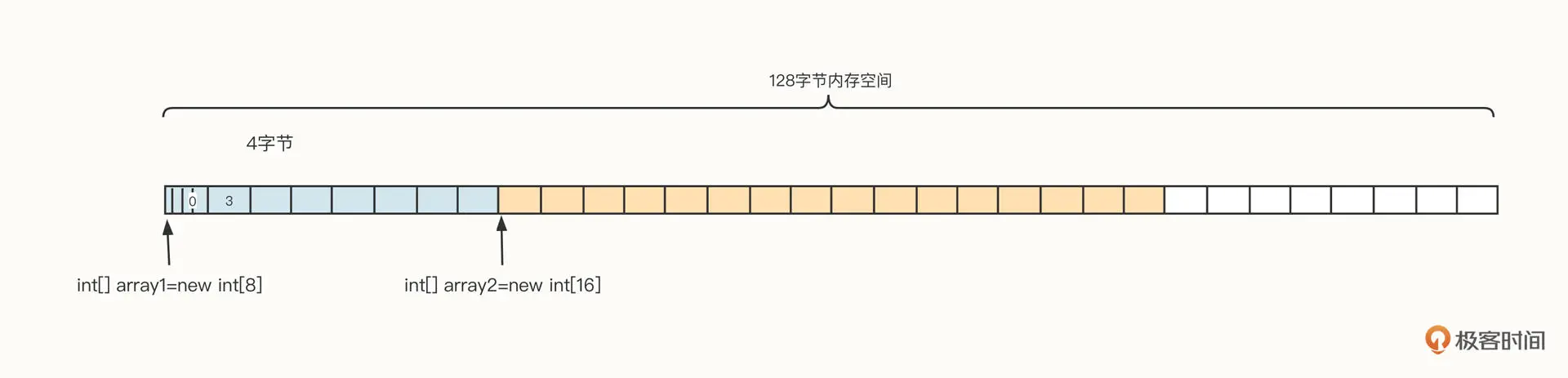 为了更直观地了解数组的内存布局,我们假设从操作系统申请了 128 字节的内存空间,它的数据结构可以参考下面这张图: