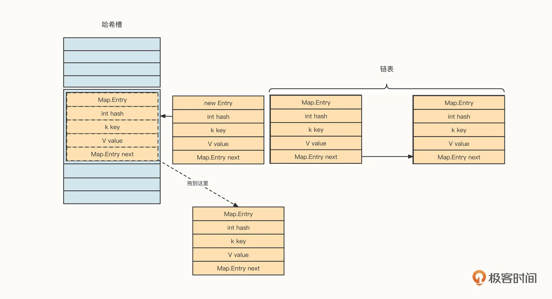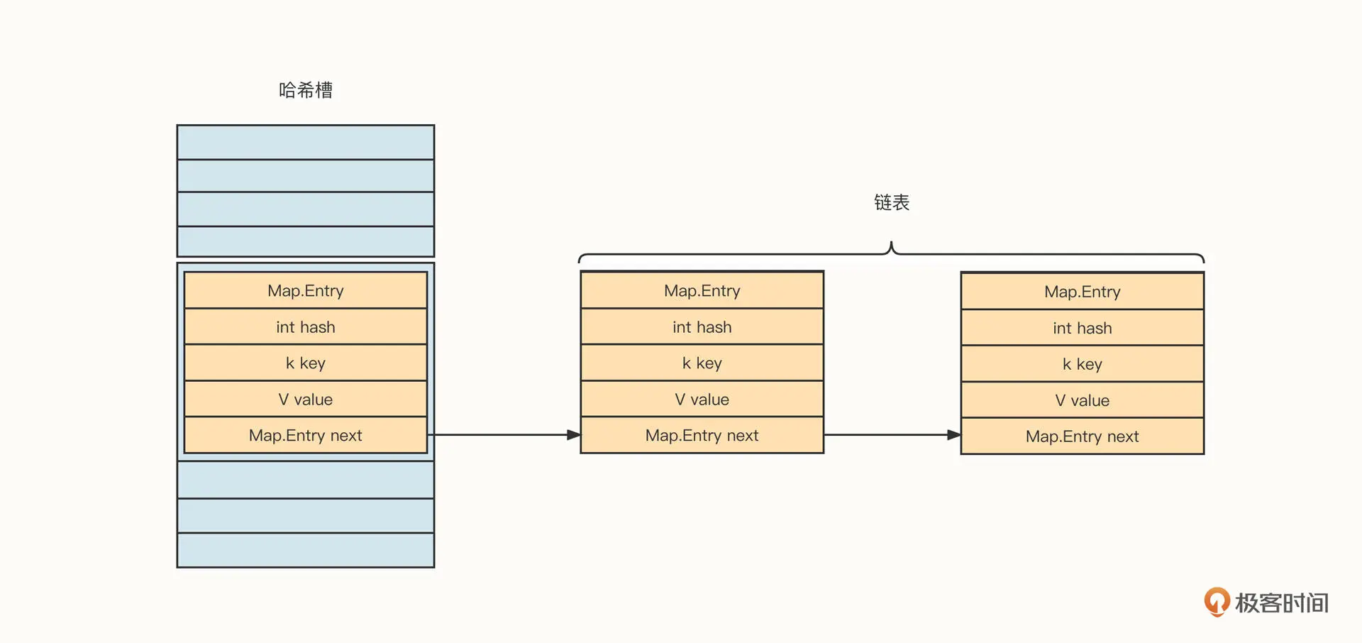 在 HashMap 中,单个键值对用一个 Map.Entry 结构表示,具体字段信息如下。