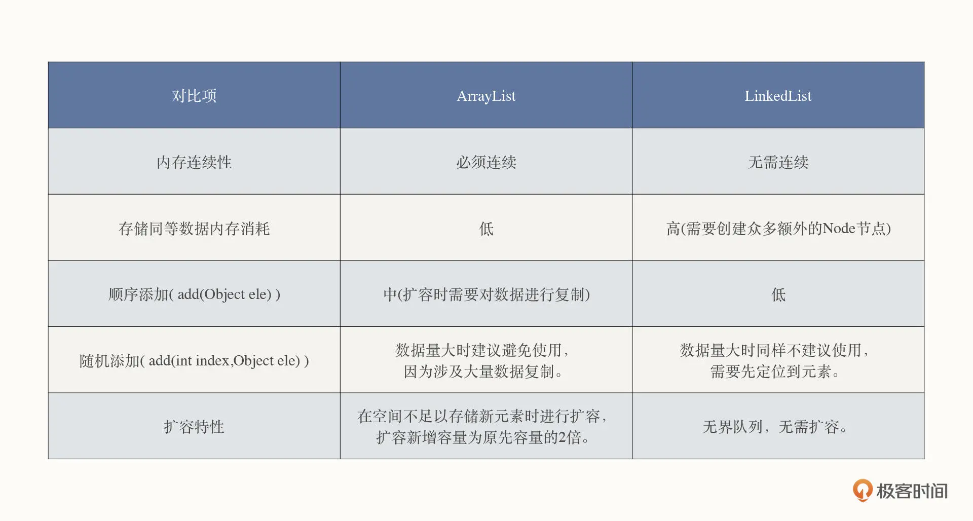 关于链表的知识点就讲到这里。由于链表与数组是数据结构中两种最基本的存储结构,为了让你更直观地了解二者的差异,我也给你画了一个表格,对两种数据结构做了对比: