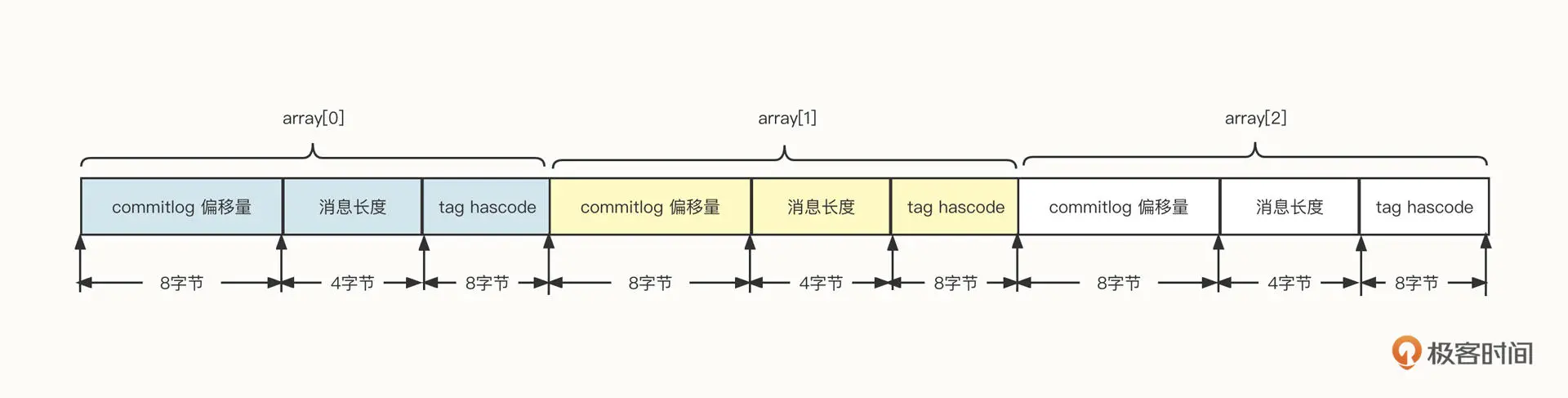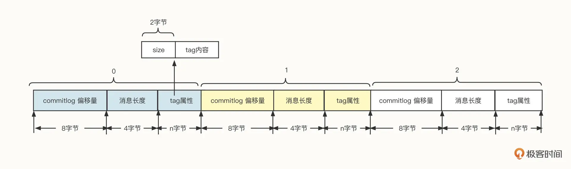 索引文件中,每一条消息都包含偏移量、消息长度和 tag 内容 3 个字段。