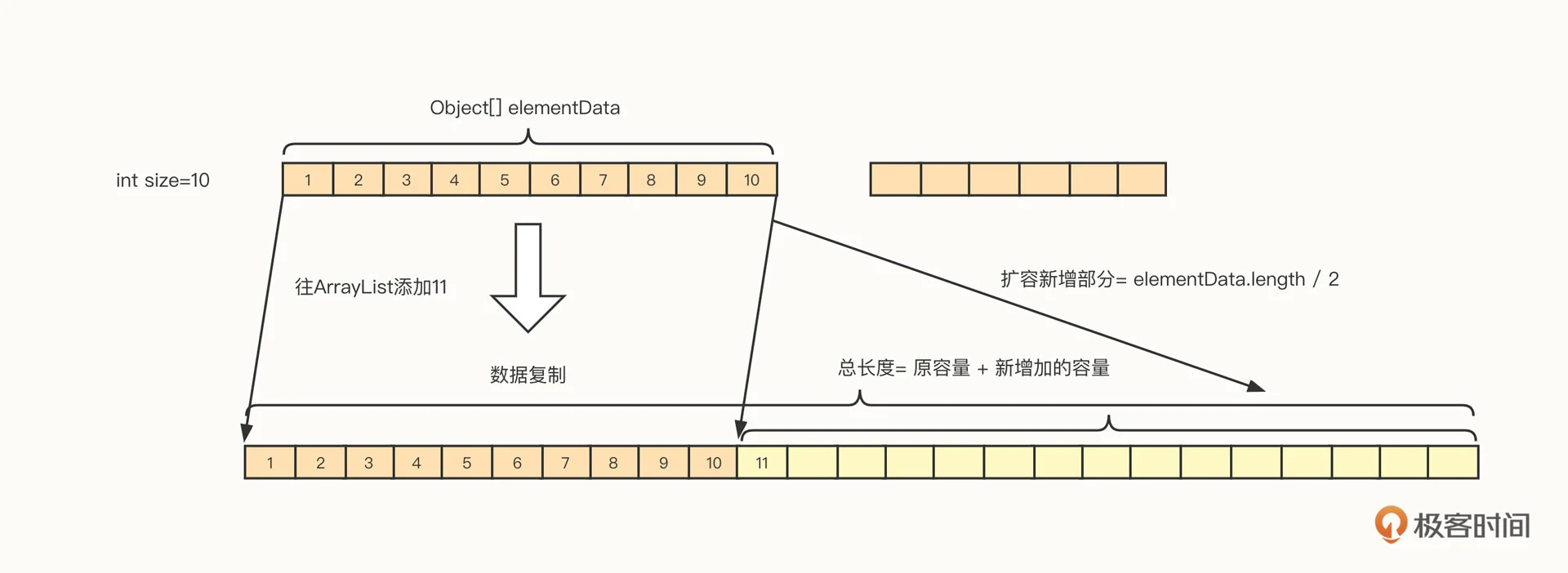 ArrayList 相比数组,增加了一个特性,它支持自动扩容。其扩容机制如下图所示:
