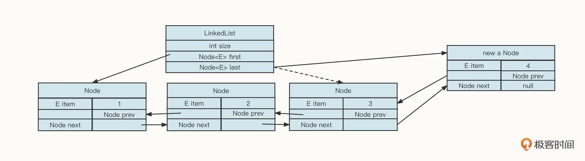 newNode.prev = oldLastNode; // 新添加的节点的prev指向源尾部节点,通过这两步,使新加入的节点添加到链表中