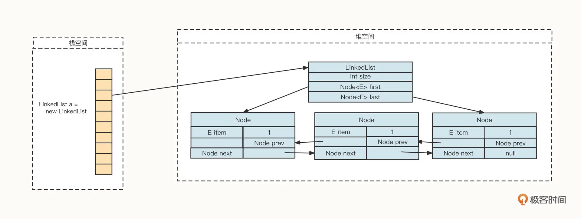 从上面这张图你可以看到,一个 LinkedList 对象在内存中通常由两部分组成:LinkedList 对象和由 Node 节点组成的链条。