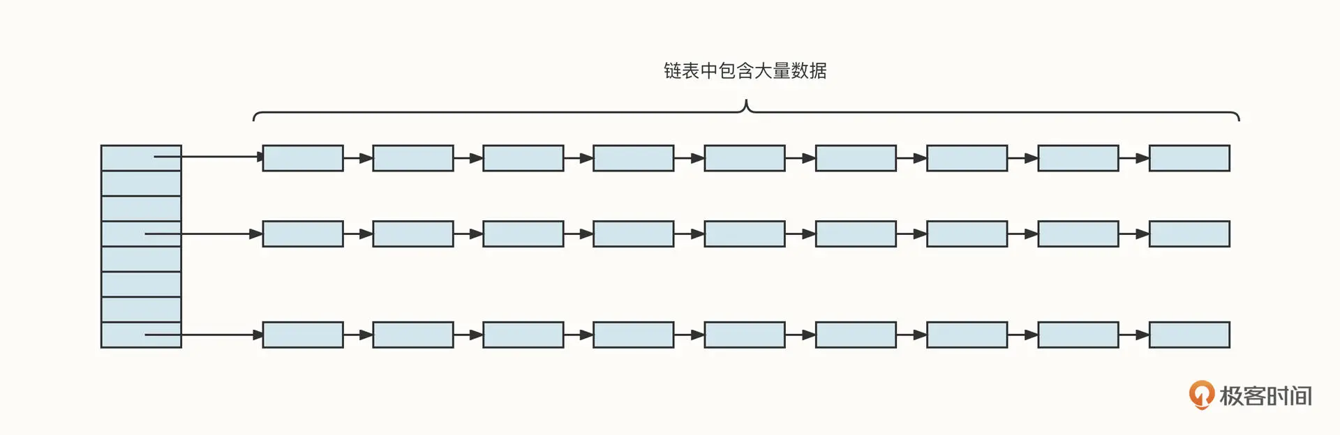 HashMap 在出现哈希冲突时,会引入一个链表,形成“数组 + 链表”的存储结构。这带来的效果就是,如果 HashMap 有 32 个哈希槽,当前存储的数据也刚好有 32 个,这些数据却不一定全会落在哈希槽中,因为可能存在 hash 值一样但是不同 Key 的数据,这时,数据就会进入到链表中。