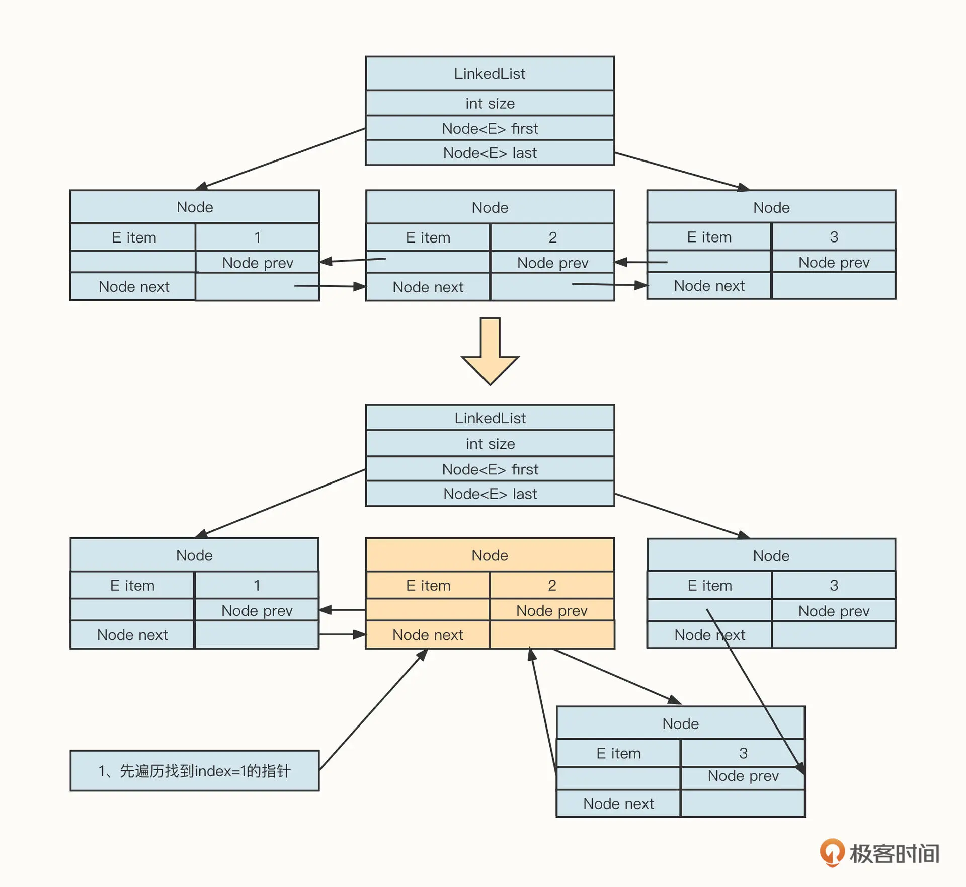 当你想要在链表前后添加或删除节点时,因为我们在 LinkedList 对象中持有链表的头尾指针,可以非常快地定位到头部或尾部节点。也就是说,这时如果我们想要增删数据,都只需要更新相关的前驱或后继节点就可以了,具体操作如下图所示: