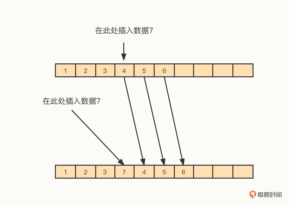 在插入元素时,我们将需要插入数据的下标用 index 表示,将 index 之后的依次向后移动 (复制到 index + 1),然后将新数据存储在下标 index 的位置。