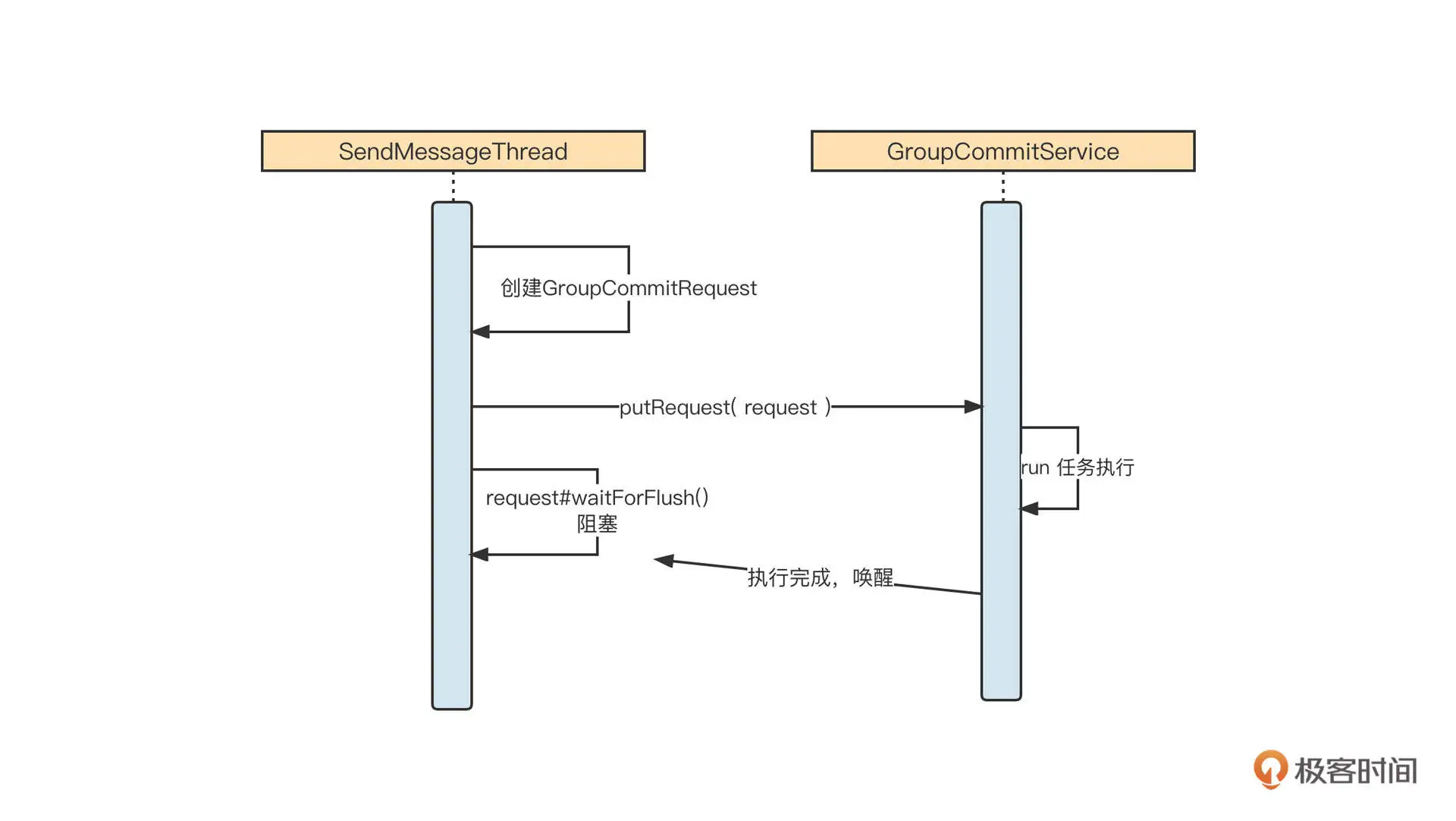 可以看到,SendMessageThread 会首先创建一个 GroupCommitRequest 请求对象,并提交到刷盘线程,然后发送线程阻塞,等待刷盘动作完成。刷盘线程在执行具体刷盘逻辑后,会调用 request 的通知方法,唤醒发送线程。