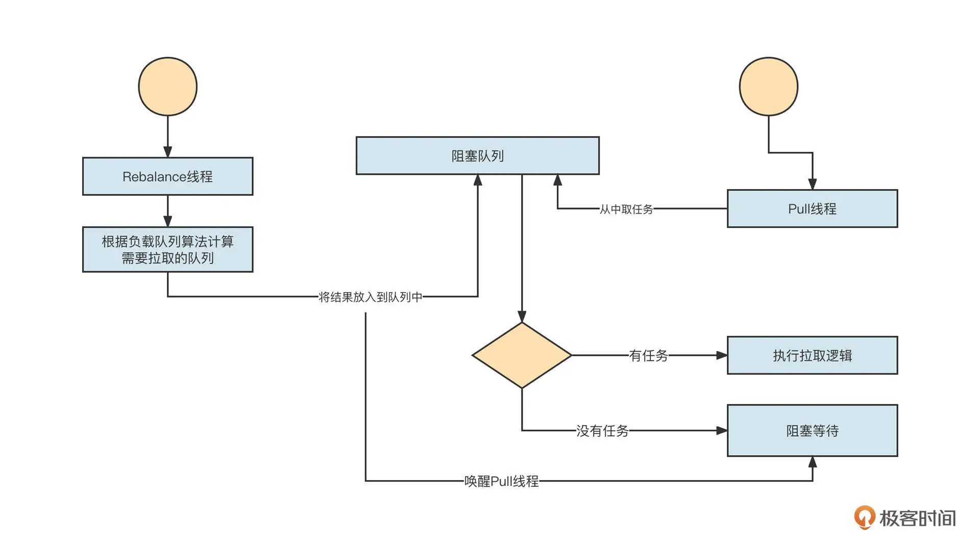 Rebalace 线程作为生产者,会根据业务逻辑生成消息拉取任务,然后 Pull 线程作为消费者会从队列中获取任务,执行对应的逻辑;如果当前没有可执行的逻辑,Pull 线程则会阻塞等待,当生产者将新的任务存入到阻塞队列中后,Pull 线程会再次被唤醒。