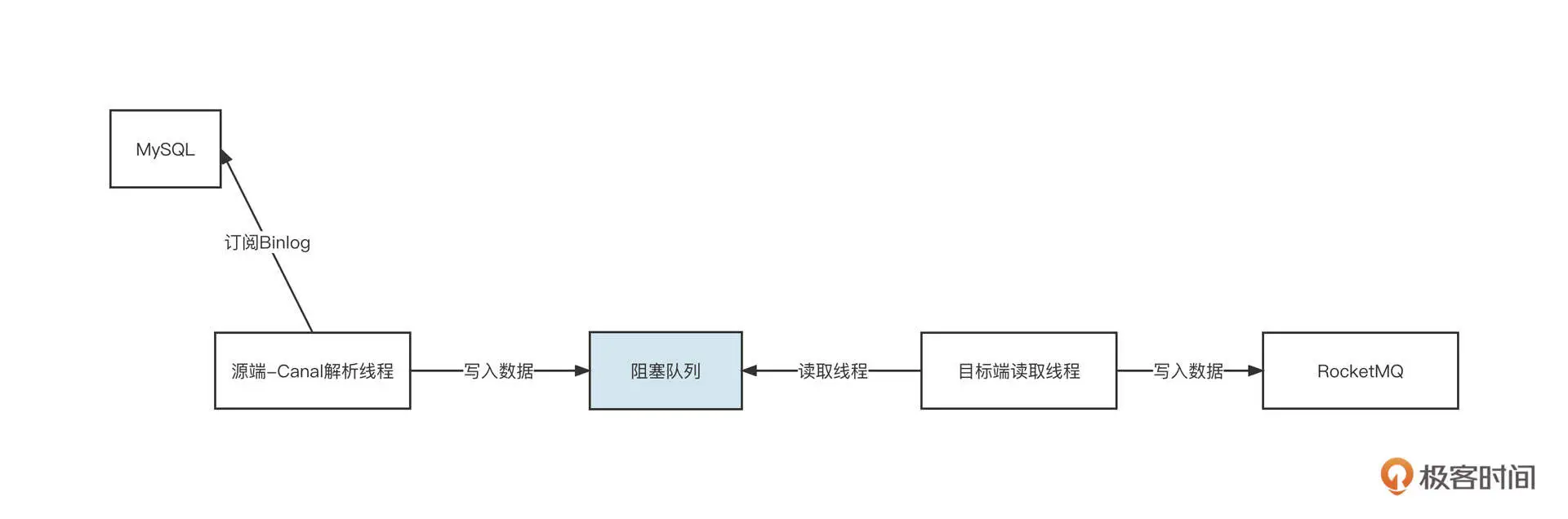 为了实现 MySQL 增量同步,Canal 线程源源不断地将 MySQL 数据写入到阻塞队列,然后目标端线程从队列中读取数据并写入到 MQ。如果写入端的写入速度变慢,阻塞队列中的数据就变得越来越多,一旦不加以控制就可能导致内存溢出。所以,为了避免由于写入端性能瓶颈造成的整个系统的不可用,这时候需要引入有界阻塞队列。这样,队列满了之后,我们就能让源端线程处于阻塞状态,从而对源端进行限流。