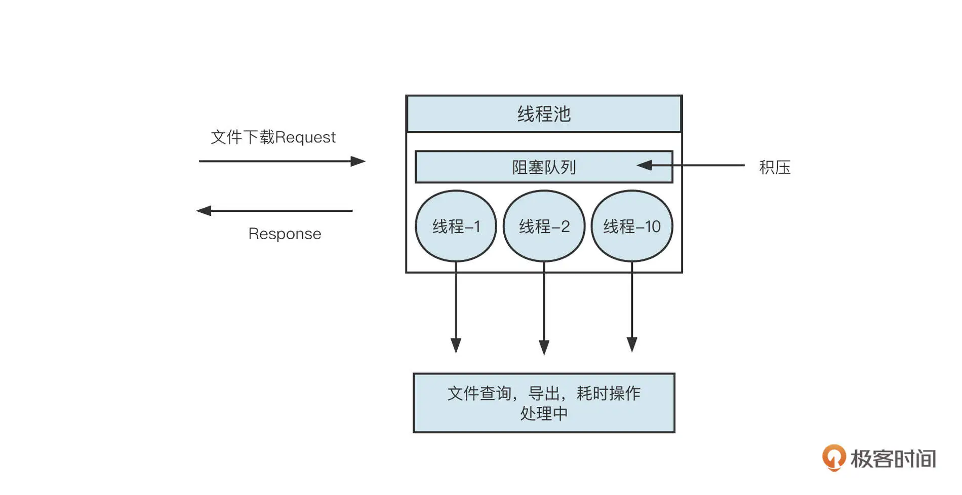 在与用户交互的场景中,如果几十万个文件下载请求同时提交到线程池,当线程池中的所有线程都在处理任务时,无法及时处理的请求就会存储到线程池中的阻塞队列中。这就很容易使内存耗尽,从而触发 Full-GC,导致系统无法正常运作。