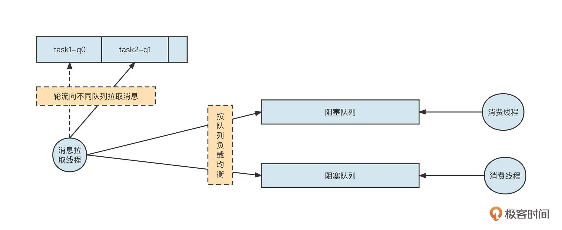 一个拉取线程轮流从 Broker 端队列 (q0、q1) 中拉取消息,然后根据队列分别放到不同的阻塞队列中,每一个阻塞队列会单独分配单个或多个线程去处理。