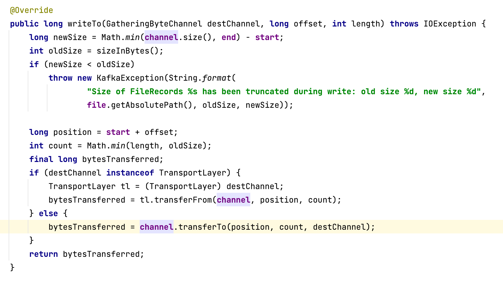 Kafka 服务端处理消息写入的代码定义在 MemoryRecords 的 writeTo 方法中,具体代码截图如下(具体是调用入口 LogSegment 的 append 方法):