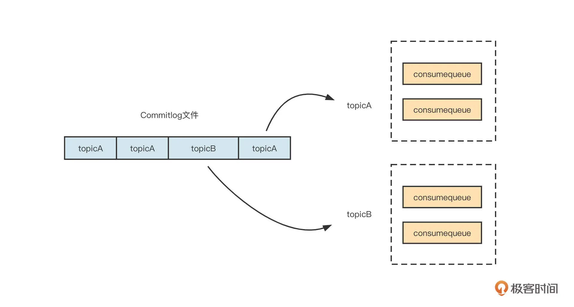 RocketMQ 所有主题的消息都会写入到 commitlog 文件中,然后基于 commitlog 文件构建消息消费队列文件(Consumequeue),消息消费队列的组织结构按照 /topic/{queue} 来组织。从集群的视角来看如下图所示: