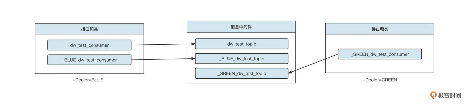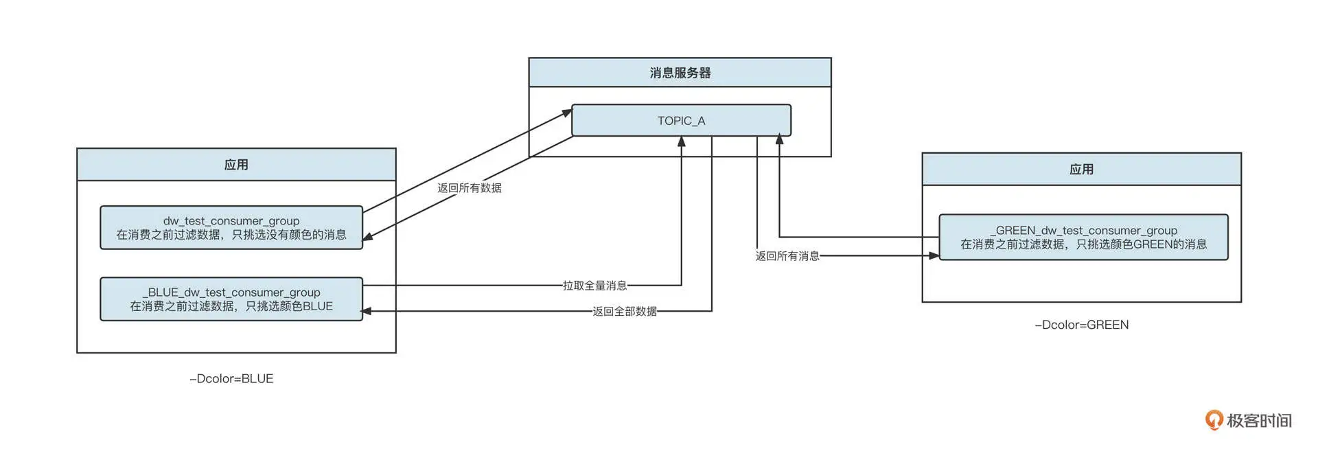 这样定义了之后,应用启动时,如果消费者的蓝绿状态为蓝,我们会同时启动两个消费组,一个消费组为 _BLUE_dw_test_consumer_group,用来专门消费蓝颜色的消费者;另外一个消费组为 dw_test_consumer_group,用来消费不带颜色的消息。蓝环境的应用在启动时只会创建一个消费组,那就是 _GREEN_dw_test_consumer_group。