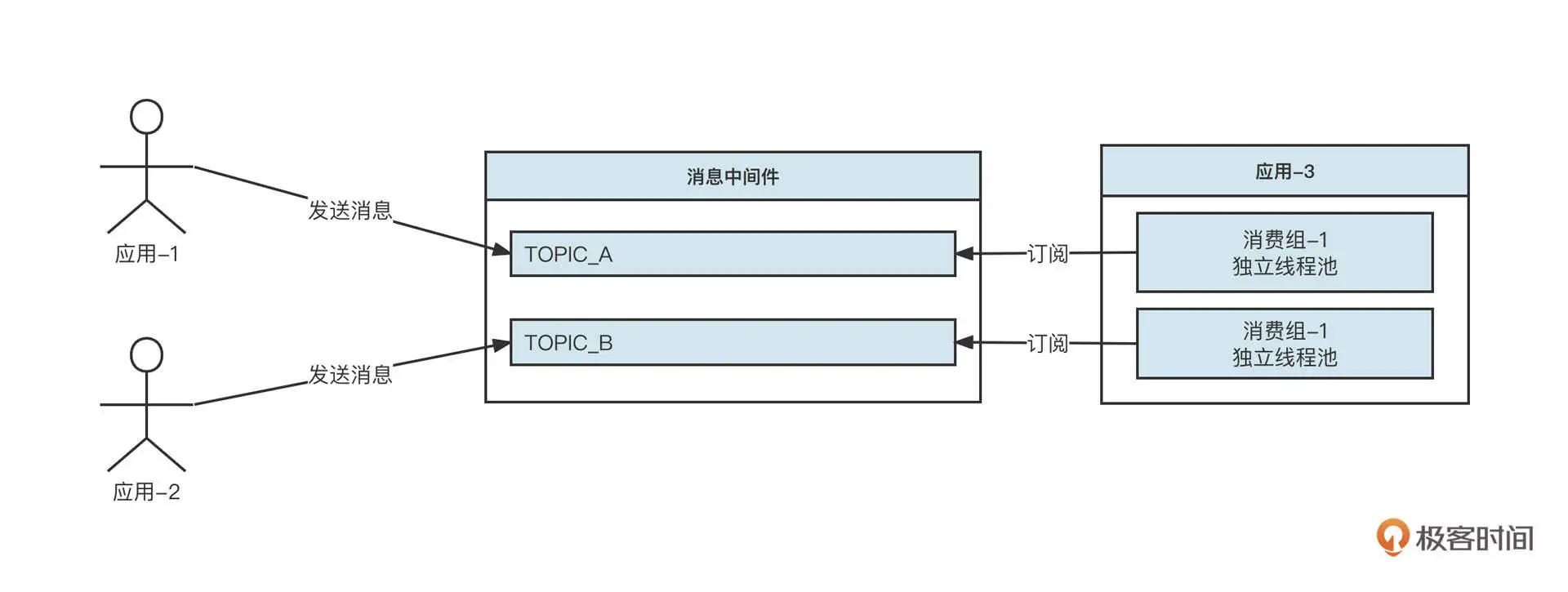 基于主题的隔离机制在消息服务端是分开存储的,属于物理层面的隔离。在消息消费端,由于应用使用不同的消费组进行消费,每一个消费组在物理层面也是互不影响的,每一个消费组有独立的线程池、消费进度等。
