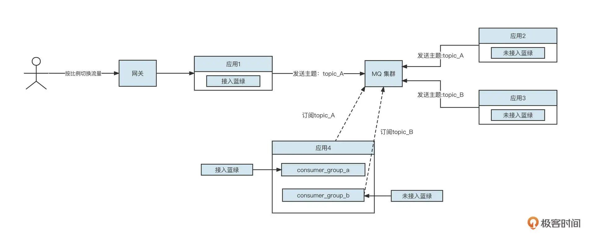 应用 2 不支持蓝绿发布,但同样需要在处理完业务后,向消息中间件中的 topic_A 发送消息。