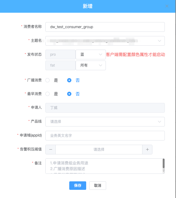 所以基于消费组的蓝绿定义,首先需要在消费者的元信息中定义。例如,我们公司在申请消费组时,可以根据环境为消费组设置是否启用蓝绿机制。如下图所示: