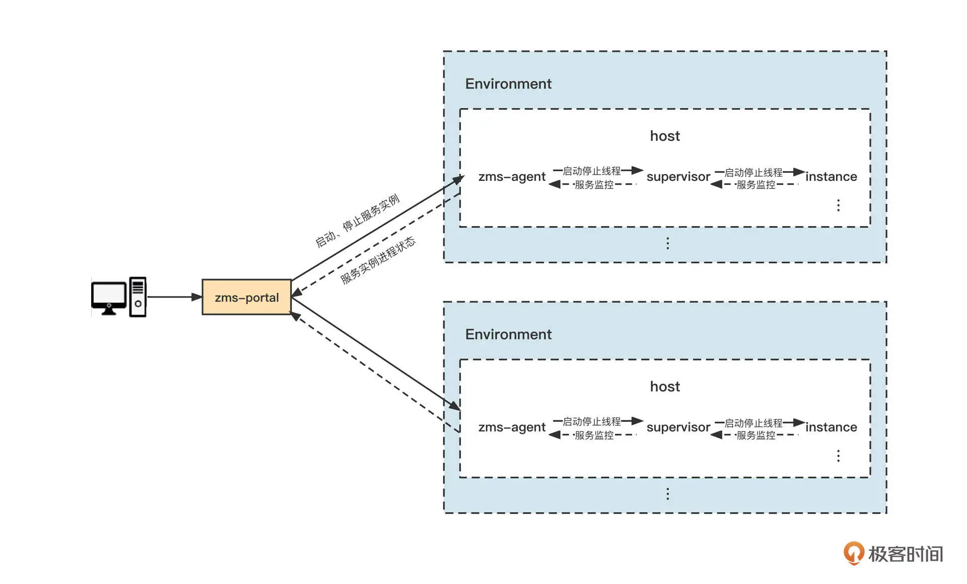 顺便说一句,ZMS 是通过在主机上安装代理,来实现对主机上服务的控制的,这种控制包括服务启动、停止、重启等操作。同时,我们还可以通过 agent 把服务进程和主机状态上报到 zms-portal,实现对主机和服务进程的监控。