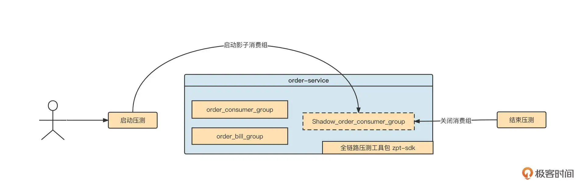 在需要进行全链路压测时,用户如果在全链路压测页面启动压测任务,就将该任务下消费组的 enable 属性设置为 1,同时更新 ZooKeeper 中的值。一旦节点的值发生变化,zpt-sdk 将收到一个节点变更事件,并启动对应消费组的影子消费组。