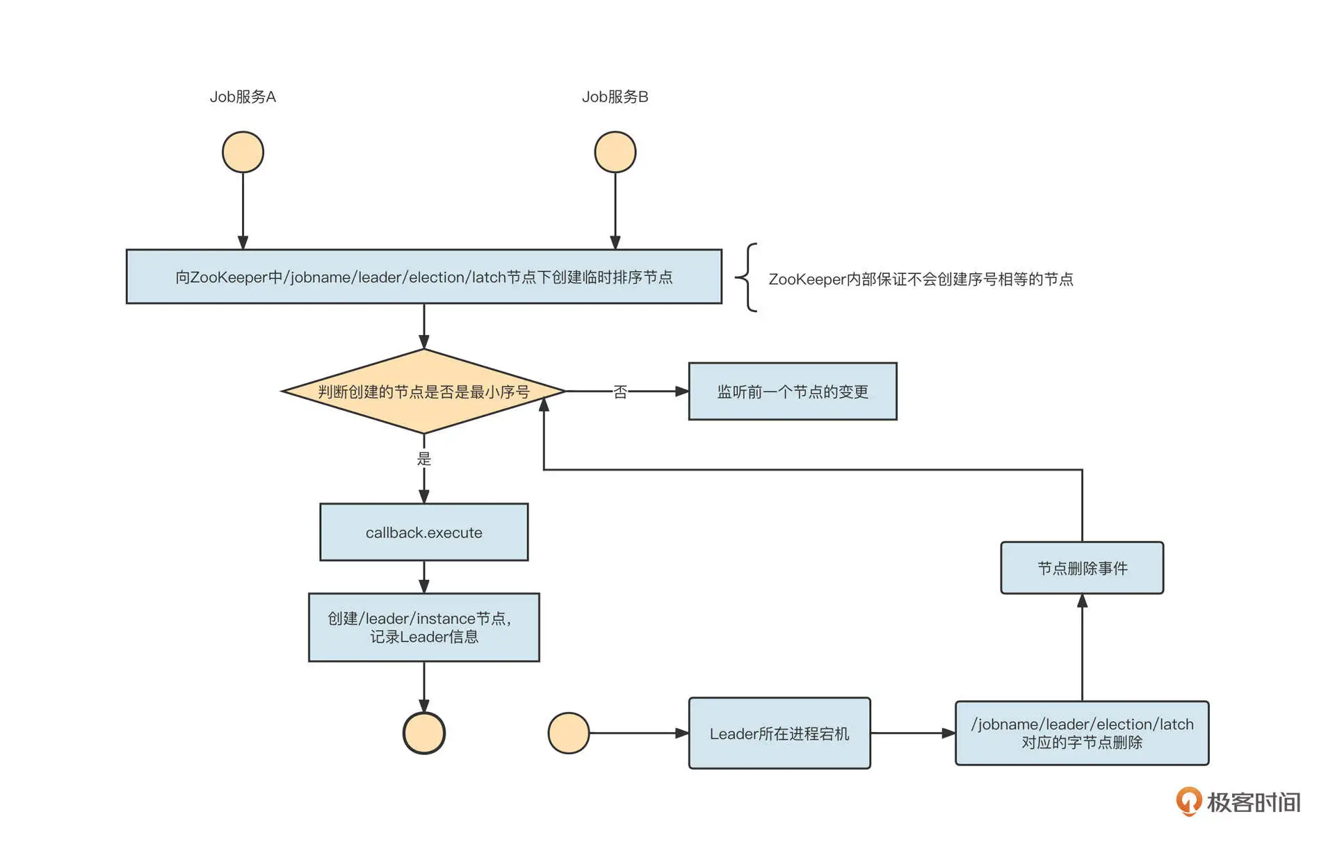 我们这节课重点关注的是 ElectionListenerManager 的实现细节,掌握基于 ZooKeeper 事件通知的编程技巧。