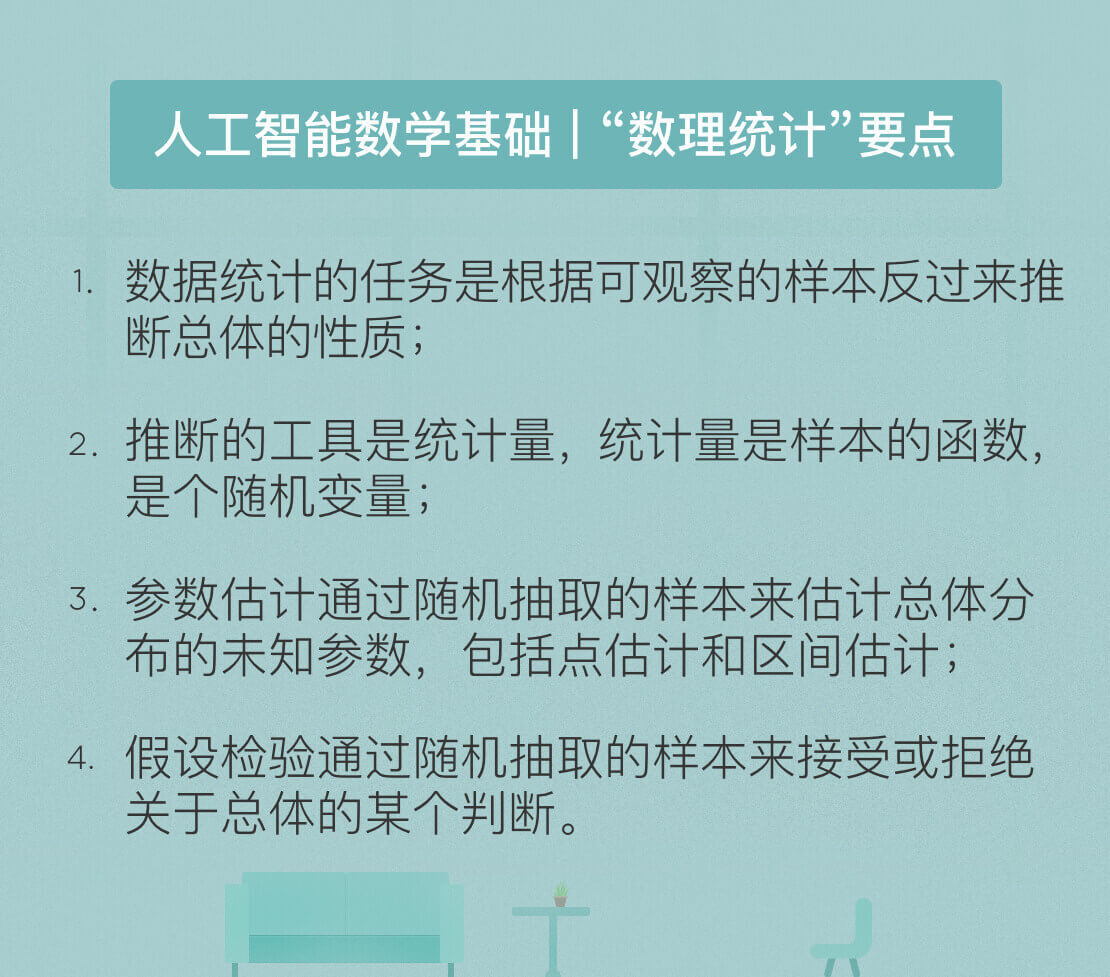 在人工智能的研究中,数理统计同样不可或缺。基础的统计理论有助于对机器学习的算法和数据挖掘的结果做出解释,只有做出合理的解读,数据的价值才能够体现。数理统计(mathematical statistics)根据观察或实验得到的数据来研究随机现象,并对研究对象的客观规律做出合理的估计和判断。