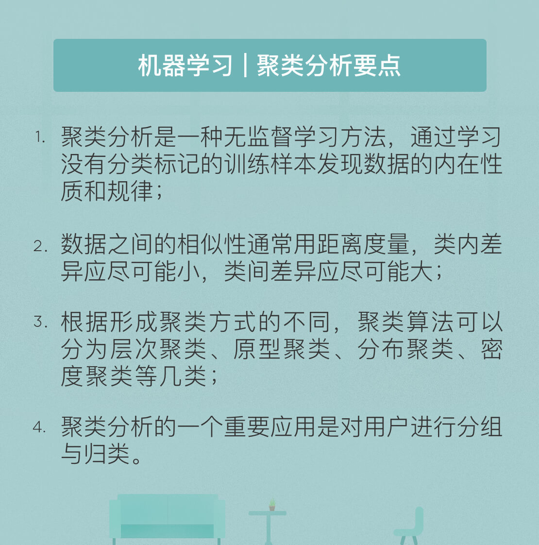 今天我和你分享了机器学习基本算法之一的聚类分析的基本原理,其要点如下: