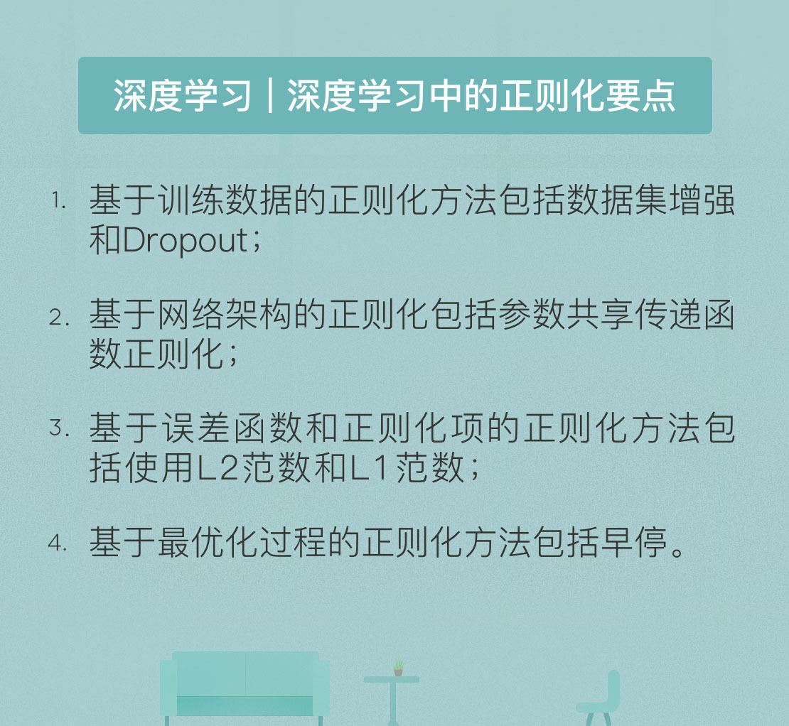 需要注意的是,以上的分类方式并不是互斥的,一种正则化方法通常针对的是学习算法中的多个变量。做出分类的目的是帮助你更好地理解正则化的设计思路。此外,前文对具体正则化方法的介绍也是挂一漏万。正则化是深度学习研究中最活跃的领域之一,如果要深入了解每种方法,最好的办法莫过于阅读原始文献。
