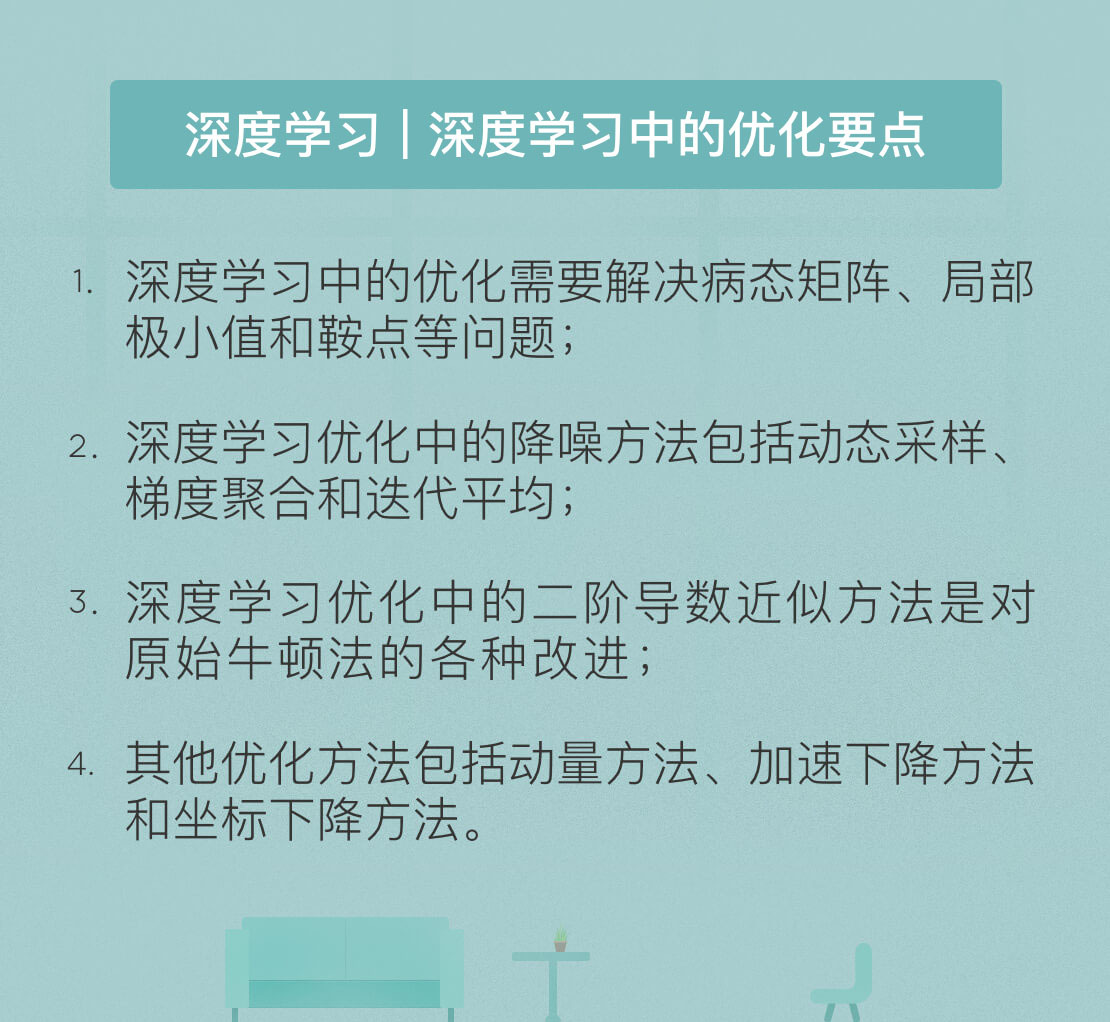 除了正则化之外,优化也是深度学习需要解决的一个核心问题。由于深度神经网络中的隐藏层数目较多,因而将整个网络作为一个整体进行优化是非常困难的事情,需要花费大量的时间和计算力。出于效率和精确性的考虑,在深度学习的优化上需要使用专门的技术。