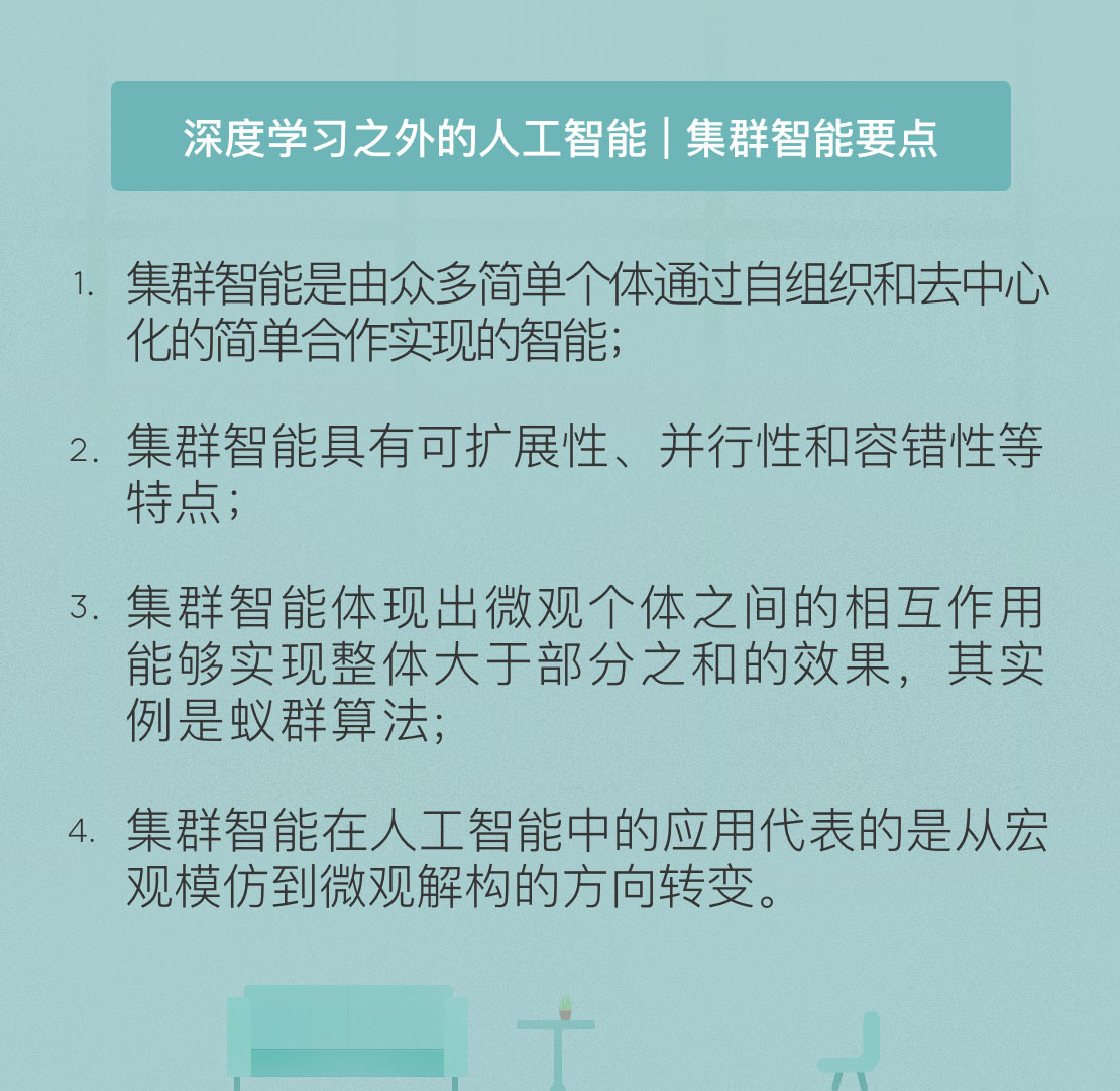 今天我和你分享了集群智能方法的现实依据,以及它所代表的研究方向。其要点如下: