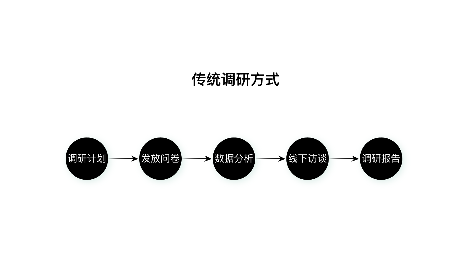 传统的调研方式大概有以下几个步骤:制定调研计划、发放问卷、数据分析、线下访谈、写调研报告。这种方式的缺点是过于重视方法及流程,结果冗长缺乏重点,更是谈不上什么洞察。