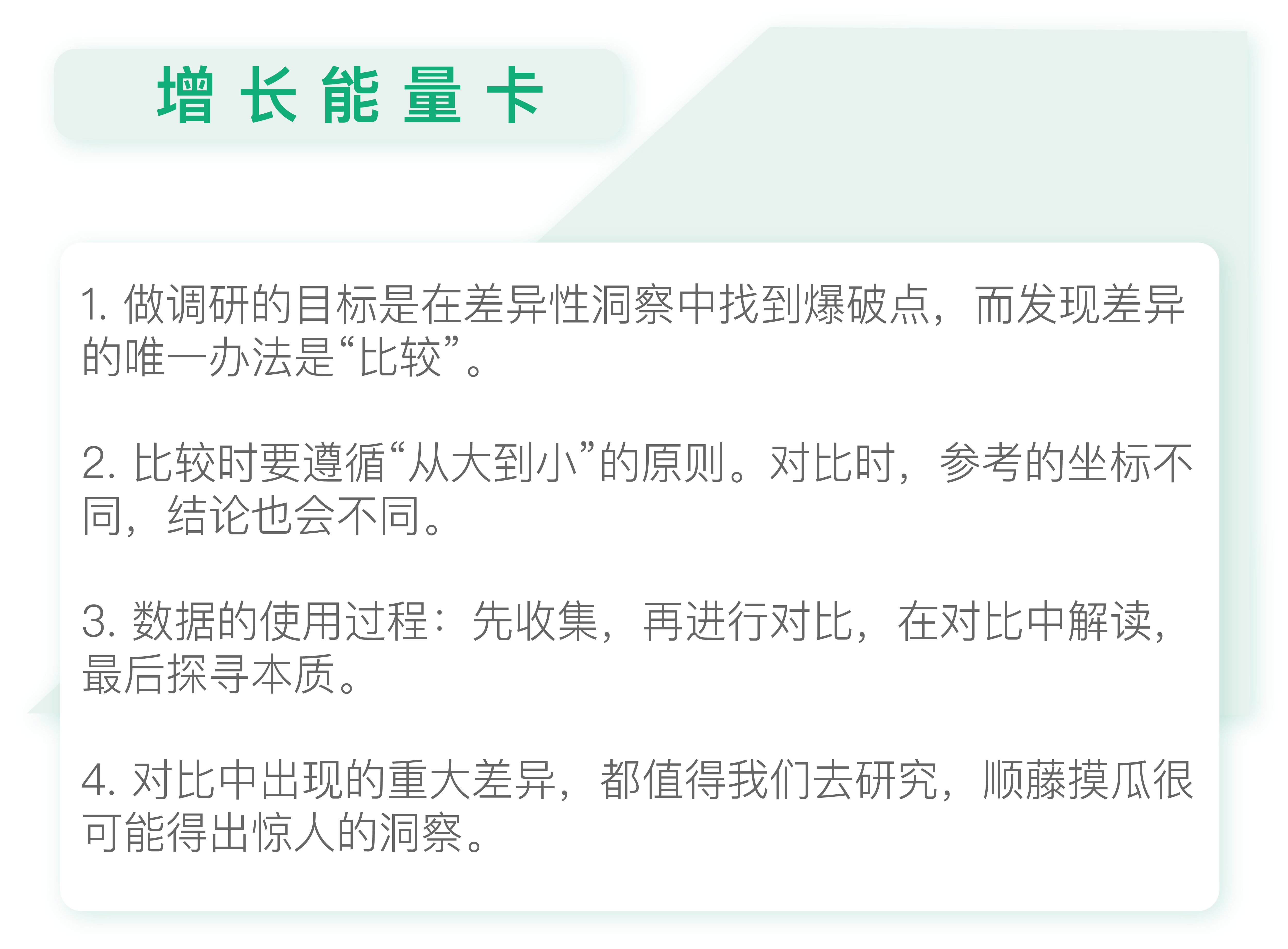 这就解释了为什么在企业中,传统的调研报告内容虽然面面俱到,却难以让人收获意外惊喜,答案就是“缺乏比较”。传统的调研报告只有各种平铺直叙的结论,很难让人有抓到重点、眼前一亮的感觉。