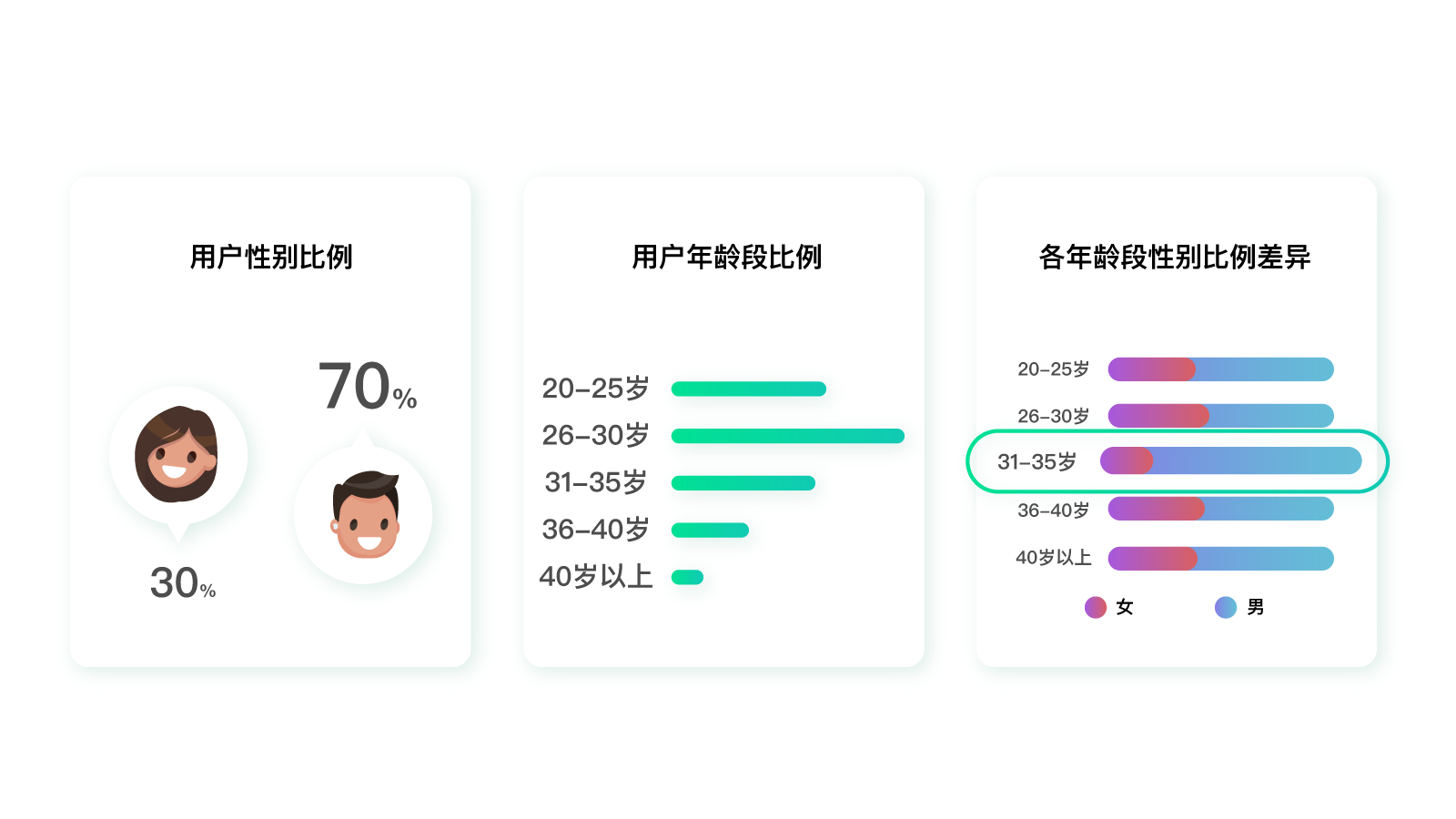 比如上图,如果一款产品的用户性别比例是30%女性、70%男性。