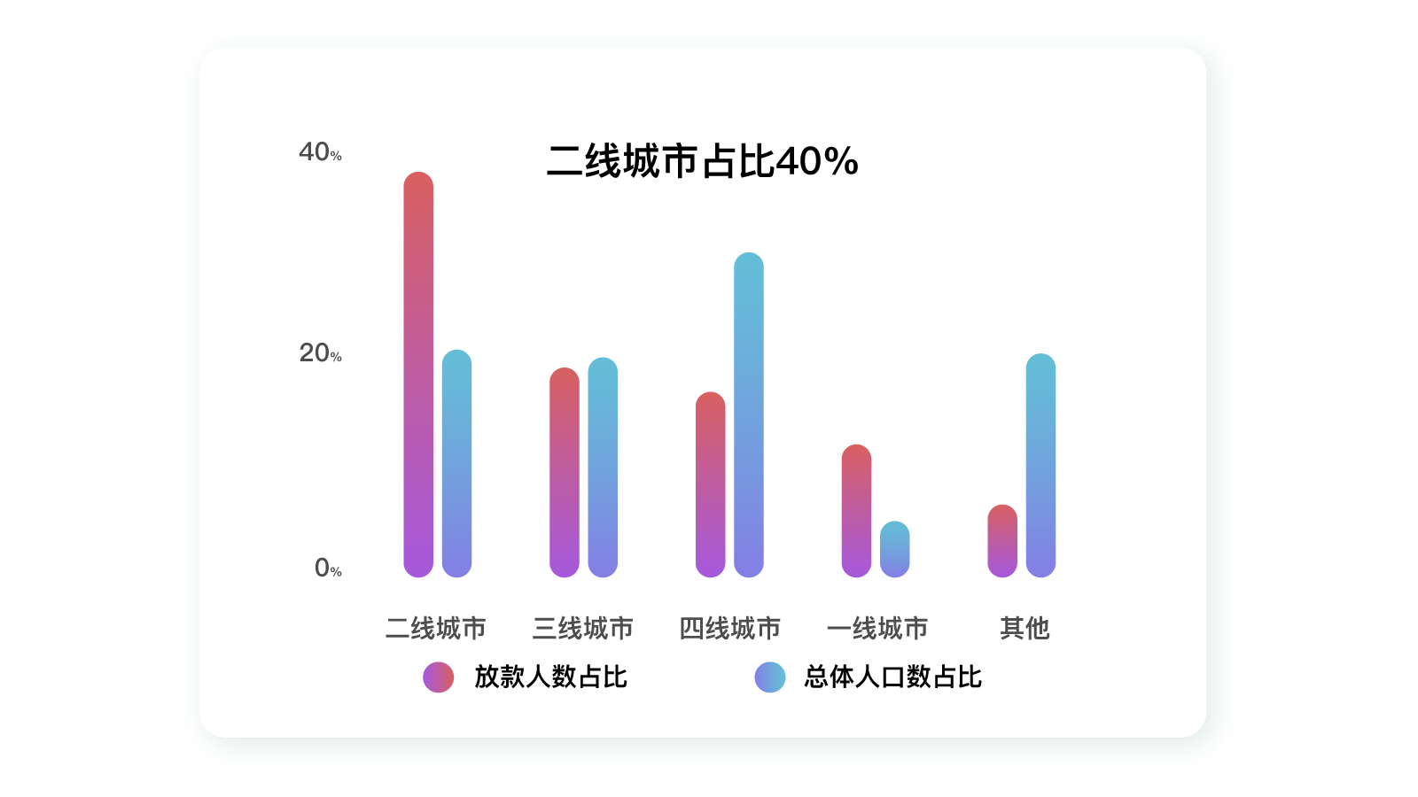 比如上图,如果单独看借款产品的地域数据(当地用户人数占产品总用户人数比例:红色柱状图),我们可以看到该借款产品用户数量在二线城市占比最高,再往后是三线城市、四线城市,一线城市排的很靠后。