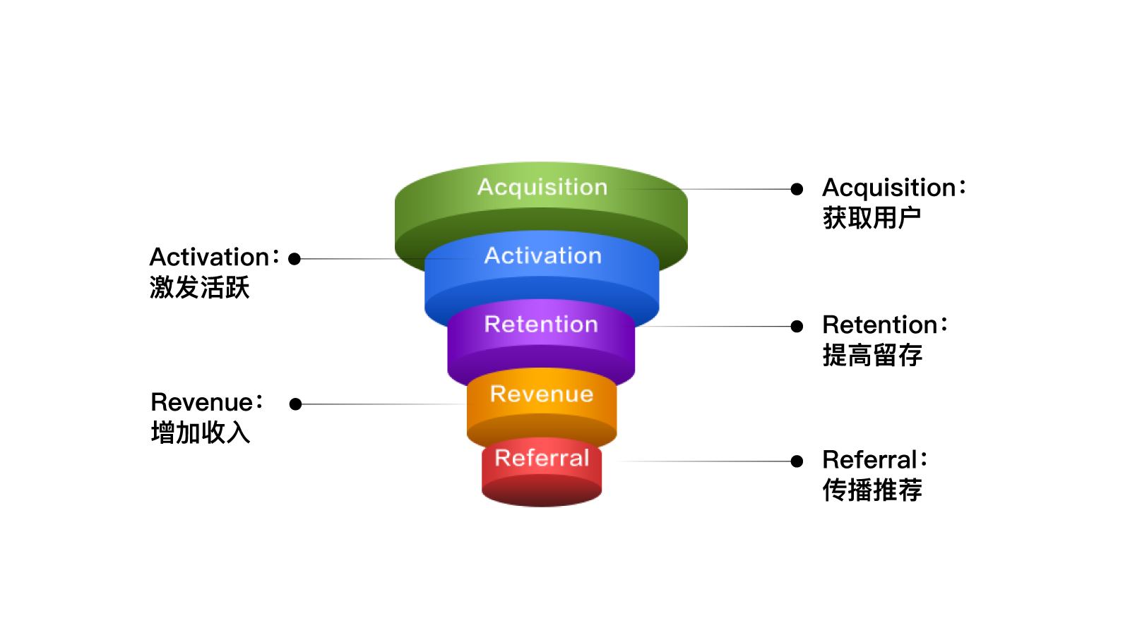 AARRR是Acquisition(获取用户)、Activation(激发活跃)、Retention(提高留存)、Revenue(增加收入)、Referral(传播推荐)这五个单词的缩写,它们分别对应一款移动应用产品生命周期中的5个重要环节。