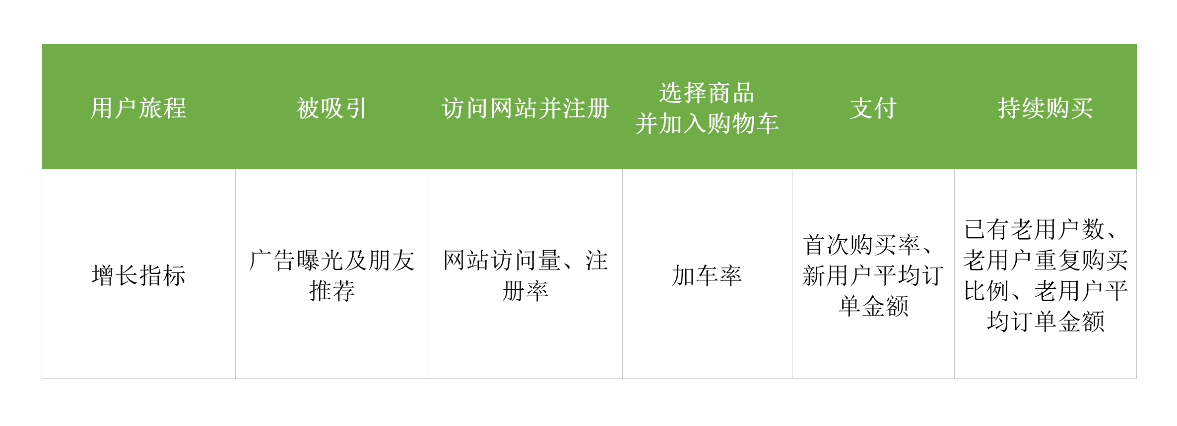 • 持续购买:已有老用户数、老用户重复购买比例、老用户平均订单金额。