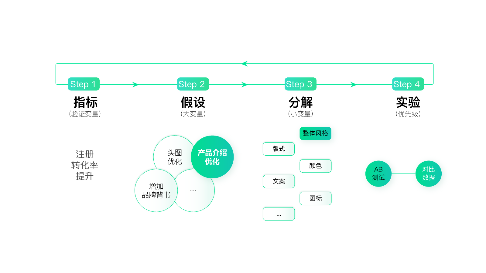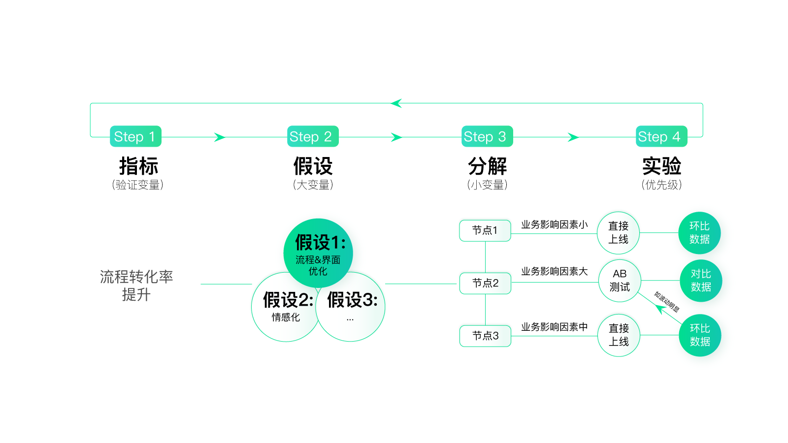 首先是指标,通过用户增长地图,我们可以看到对应的指标是“流程转化率提升”。其次是假设,为了让流程转化率提升,从设计团队的能力出发,目前最好的方式是优化界面流程体验。再次是分解,根据前面的分析,我们把整个流程分解成三部分。最后是实验,对于受业务因素影响较大的部分,可以进行AB测试,其它的看环比数据即可。