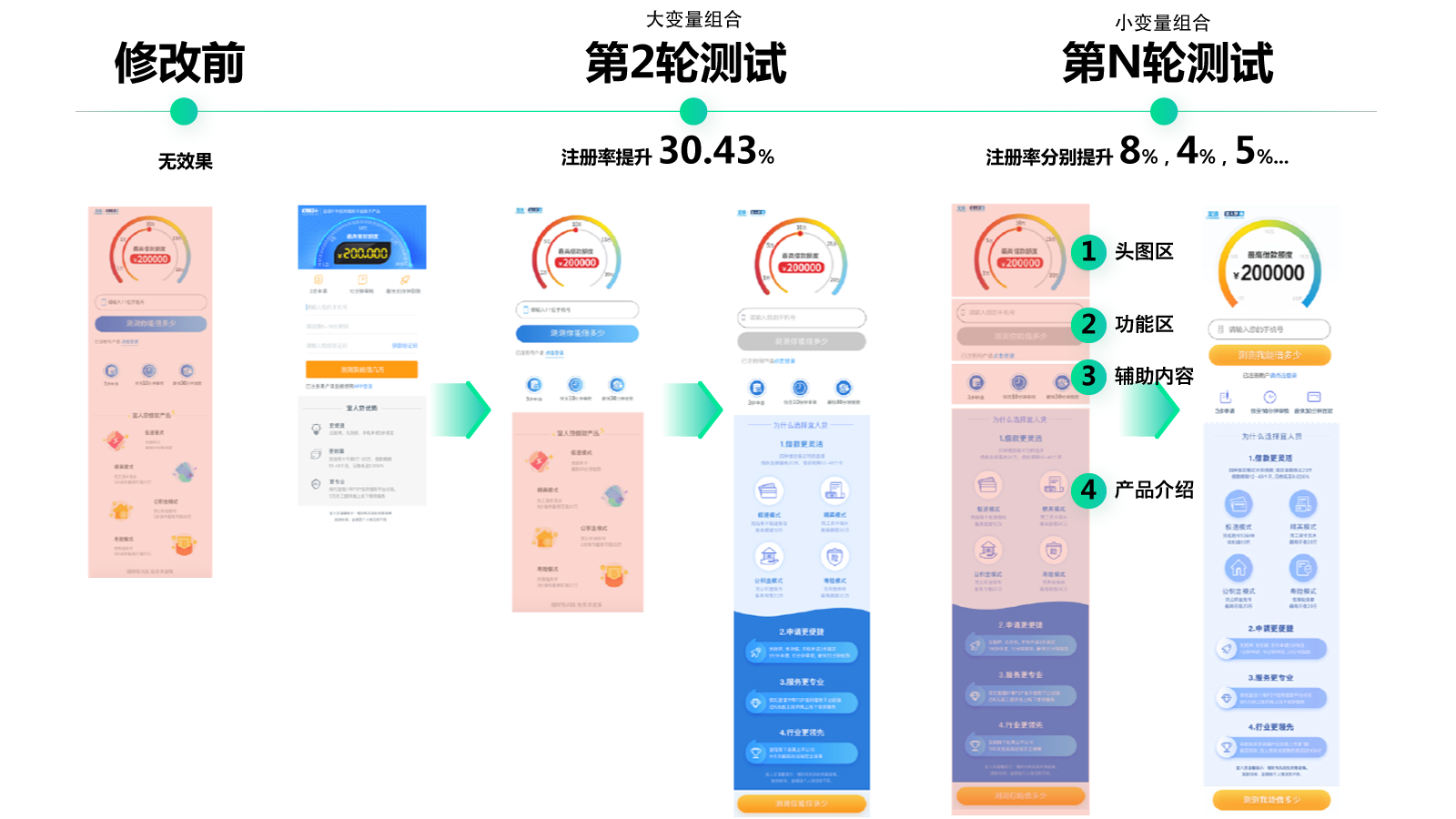 每一次的改进,数据都有所提升,不过因为分解的颗粒度变小了,所以数据提升的幅度自然也小了,但好在每一次优化都会有提升。经过40天的集中实验,最终这个页面的转化累计提升70%以上,为公司节约了巨额的营销成本。